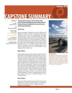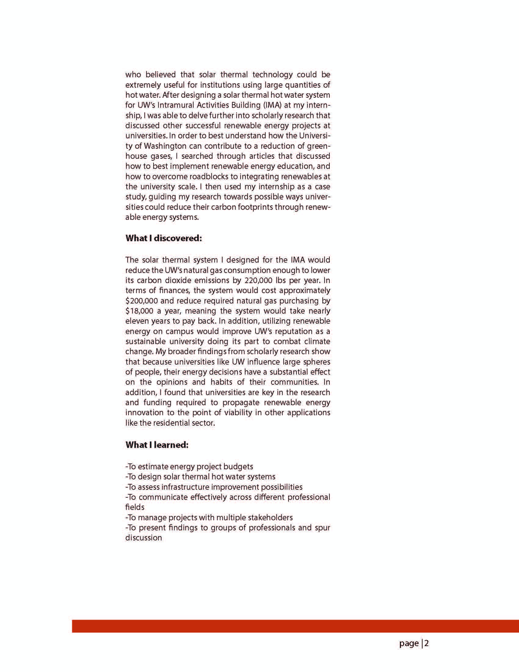During my project, I looked for ways the University of Washington could both reduce its carbon footprint and minimize energy costs by implementing renewable energy systems on campus. After hearing about an obso- lete steam heating system that needs to be replaced from UW Facilities Services, I took the opportunity to design a solar thermal system that could provide hot water to keep the Intramural Activities Building’s swimming pool warm throughout the year. Through scholarly research and hands-on planning, I found that implementing such a system would provide the UW with benefits to their budget and the environment.