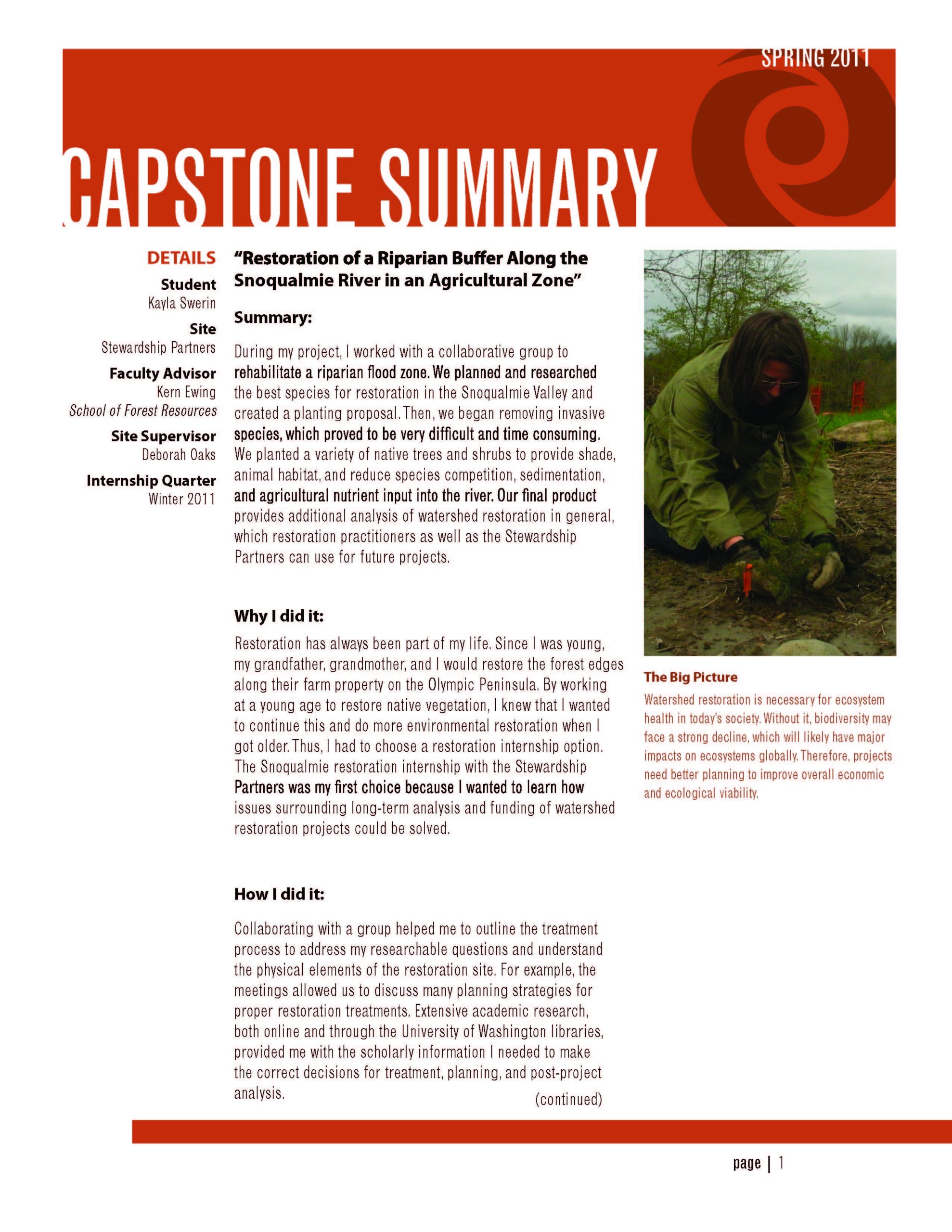 During my project, I worked with a collaborative group to rehabilitate a riparian flood zone. We planned and researched the best species for restoration in the Snoqualmie Valley and created a planting proposal. Then, we began removing invasive species, which proved to be very difficult and time consuming. We planted a variety of native trees and shrubs to provide shade, animal habitat, and reduce species competition, sedimentation, and agricultural nutrient input into the river. Our final product provides additional analysis of watershed restoration in general, which restoration practitioners as well as the Stewardship Partners can use for future projects.