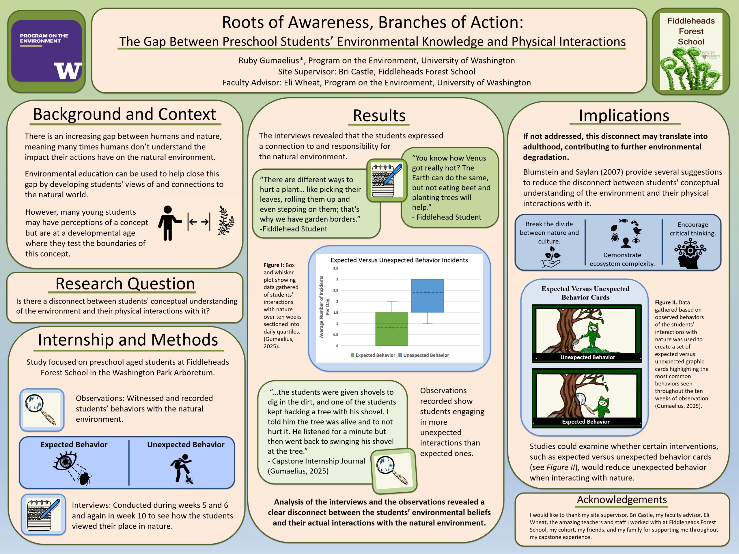 Reduced access to nature results in more individuals losing their connection to it, which makes it difficult for people to see how their actions harm the natural environment. Nature is necessary for human survival, providing sustenance and improving well-being. Environmental education (EE) can help students connect with nature and better understand the environmental effects of their actions. However, going into my internship I believed there might be a gap between students’ interactions and their perceptions of nature. My research investigates the question: What disconnects exist between students’ conceptual understanding of the natural environment and their physical interactions with it? I interned at Fiddleheads Forest School with preschool-aged children. Here, I collected data three days a week in two different classrooms by observing the students’ interactions with nature. I also conducted two rounds of interviews throughout the quarter to analyze the students’ perceptions of and connections to nature. Results from my interviews and observations reveal a disconnect between young students’ perceptions of nature and their actual interactions with it. While the interviews demonstrate the students’ expression of deep care for and connection to the natural environment, my observations revealed that the students engage in more unexpected than expected interactions with nature. These results are important because, if not addressed, a disconnect at a young age could translate into a disconnect as an adult. So, in thinking about the future, EE should focus not only on teaching concepts about nature but also promoting positive interactions with it!