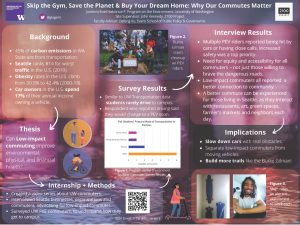 The way we get from one destination to another is an important, often overlooked part of our daily lives. Most of us hop in our cars only to crawl through soul-crushing traffic, day after day. Car-commuting, while at times efficient, also has major disadvantages – time wasted sitting in traffic, air pollution and lack of physical activity resulting in health problems, climate change worsened by tailpipe emissions, and car ownership expenses along with costly road development and maintenance are just some of the issues car-use creates. So why not park our cars for a walk or bike ride? To understand the challenges low-impact Seattle commuters face, I partnered with 2100 Project, conducting interviews with businesses and organizations focused on low-impact commute options in Seattle, as well as Seattle commuters who had ditched their cars for low impact alternatives. Interviews centered on how the city of Seattle could improve alternative commute options for those desiring to commute without their car. Improved safety and increased accessibility were the two factors most interviewees agreed were essential in helping people ditch their cars for low-impact alternatives. Commuters who chose low-impact alternatives reported a better sense of community and connection with the city, suggesting that when we prioritize low-impact commuter safety and accessibility, we will create a deeper sense of community throughout Seattle.
