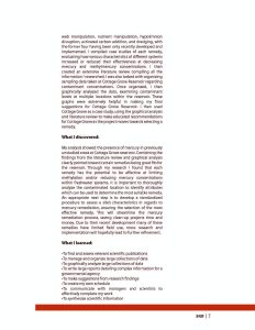 Mercury contamination in freshwater systems continues to be a widespread issue. Mercury’s persistence in the environment makes treatment difficult, prompting the development of new innovative solutions to this problem. I was tasked by the EPA to write an intensive literature review on mercury remediation techniques, to organize and graphically analyze mercury contaminated reservoir data, and to make recommendations based on my findings. I determined that the success of a treatment is largely dependent on understanding a site’s characteristics. A process to assess a site’s traits that are relevant to mercury remediation should be developed in order to streamline treatment efforts.