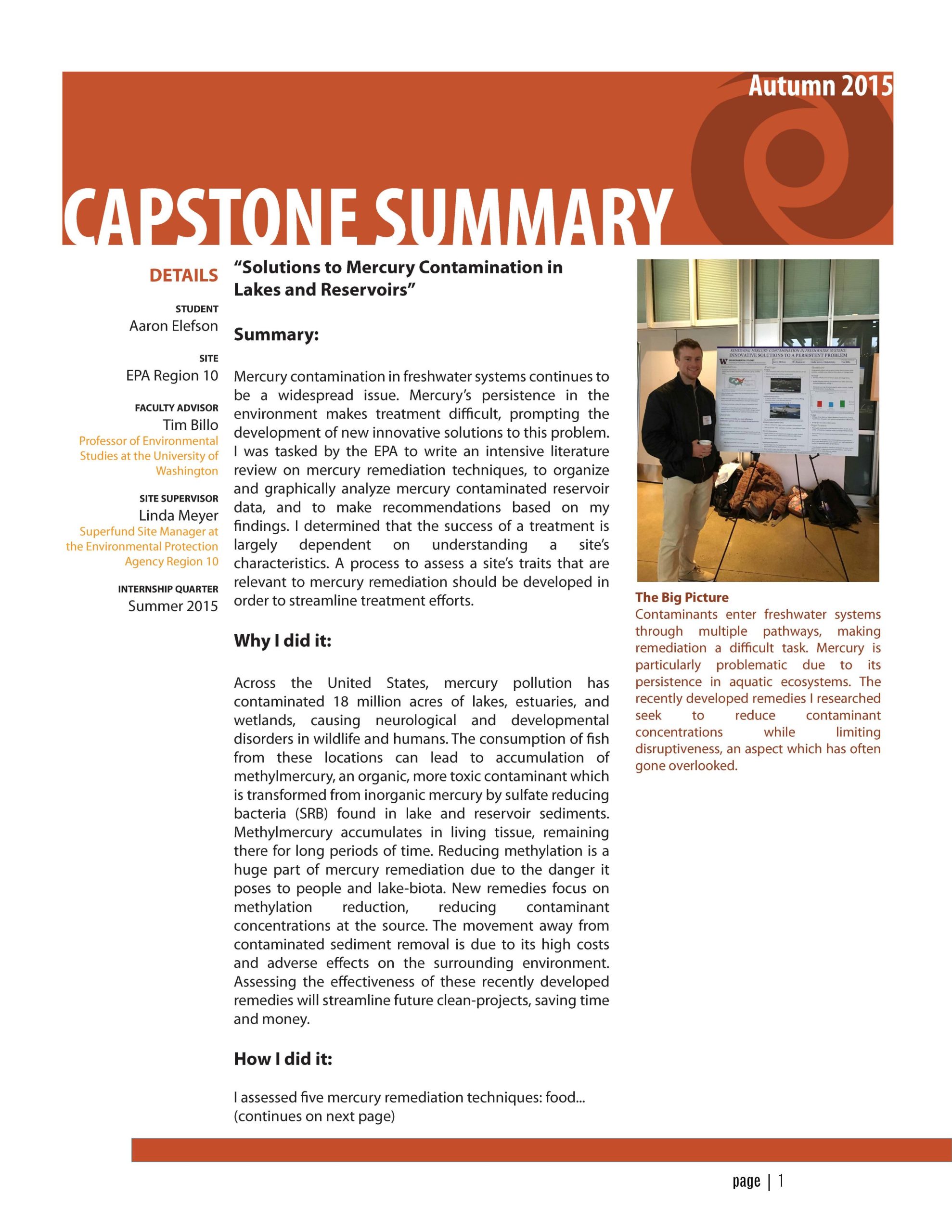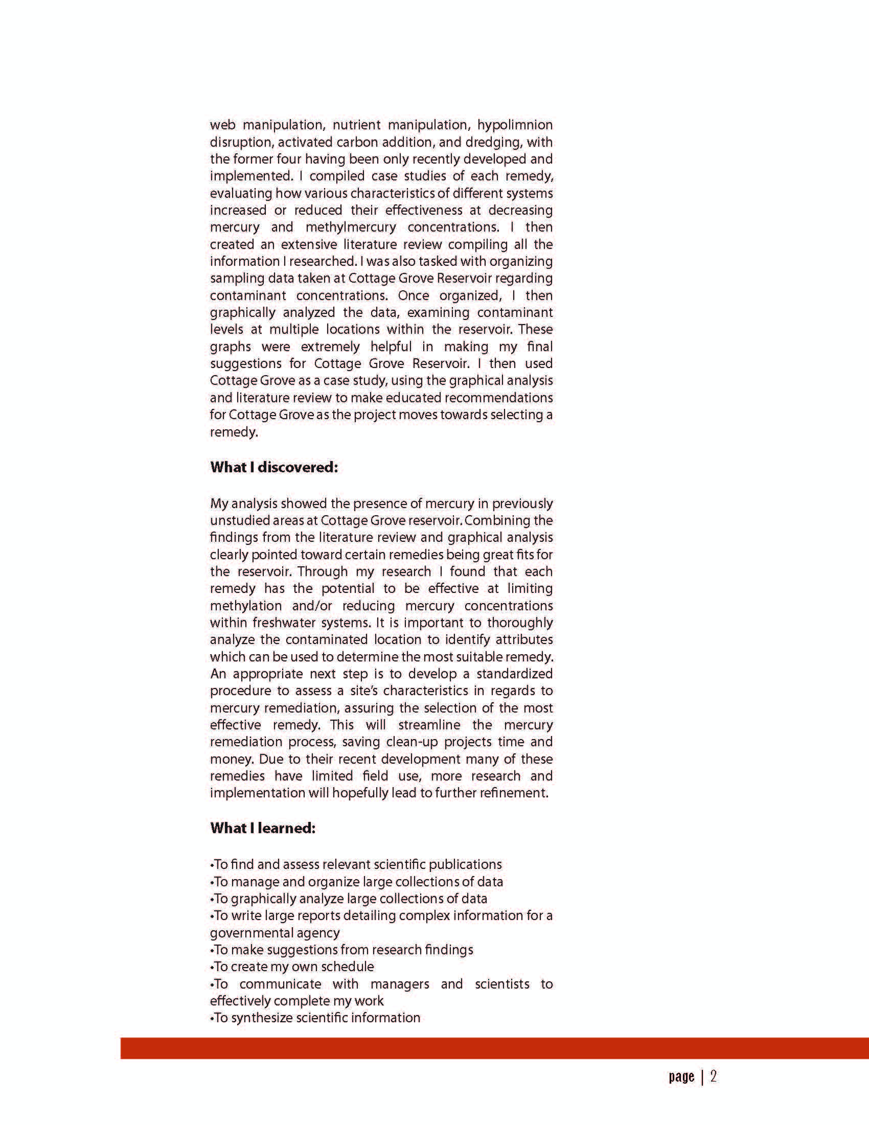 Mercury contamination in freshwater systems continues to be a widespread issue. Mercury’s persistence in the environment makes treatment difficult, prompting the development of new innovative solutions to this problem. I was tasked by the EPA to write an intensive literature review on mercury remediation techniques, to organize and graphically analyze mercury contaminated reservoir data, and to make recommendations based on my findings. I determined that the success of a treatment is largely dependent on understanding a site’s characteristics. A process to assess a site’s traits that are relevant to mercury remediation should be developed in order to streamline treatment efforts.
