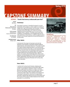 The project summary is intended to present a concise description of the project in a form useful to a variety of readers who may not be familiar with the topic. I worked at King County Wastewater Treatment Division to organize a historical walking tour of the South Park neighborhood in Seattle. This project was to promote installation of raingardens in the neighborhood and to raise awareness in local history. I used this opportunity to study the use of place-based environmental education in a community.