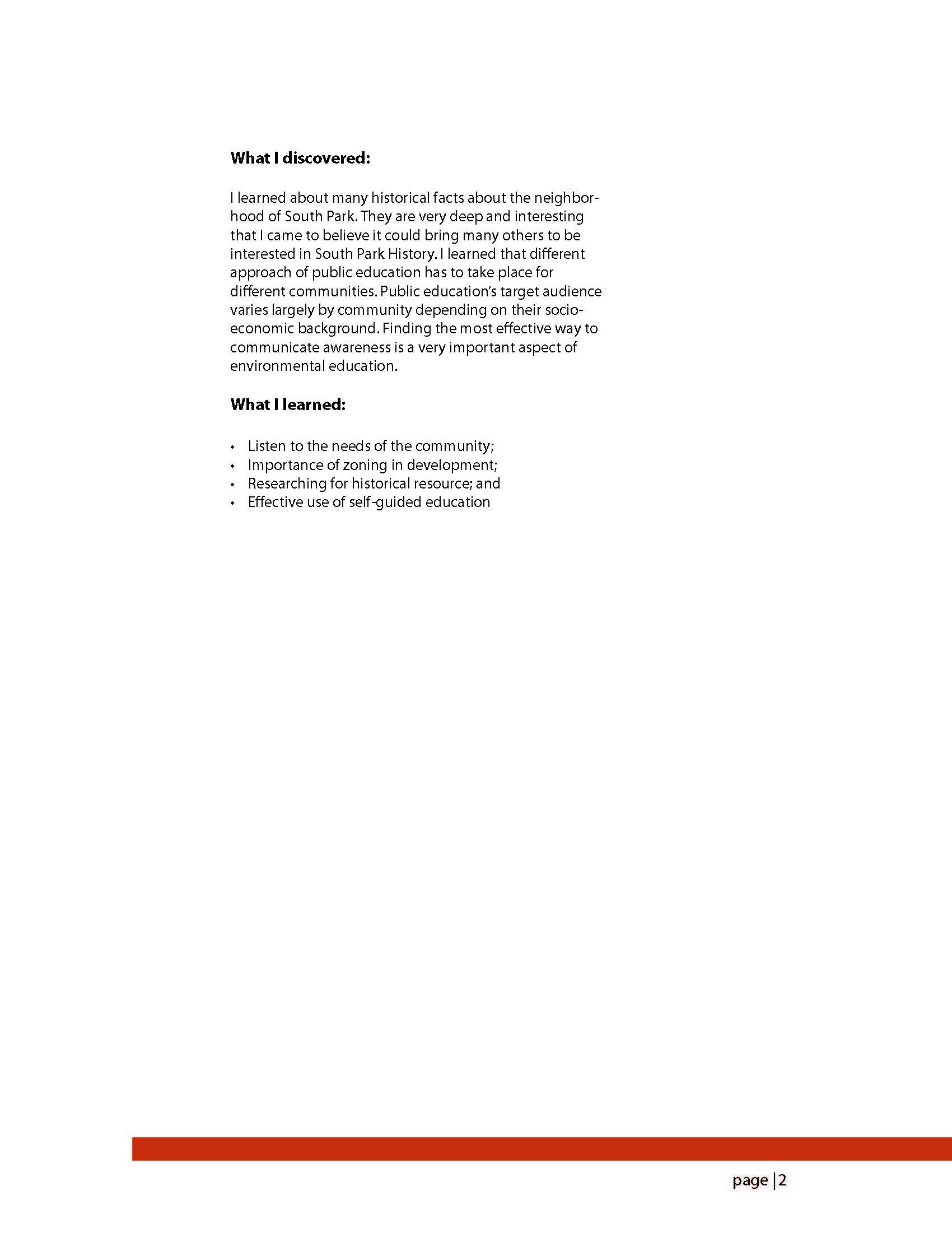 The project summary is intended to present a concise description of the project in a form useful to a variety of readers who may not be familiar with the topic. I worked at King County Wastewater Treatment Division to organize a historical walking tour of the South Park neighborhood in Seattle. This project was to promote installation of raingardens in the neighborhood and to raise awareness in local history. I used this opportunity to study the use of place-based environmental education in a community.