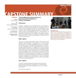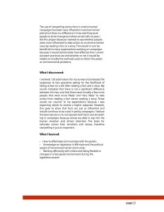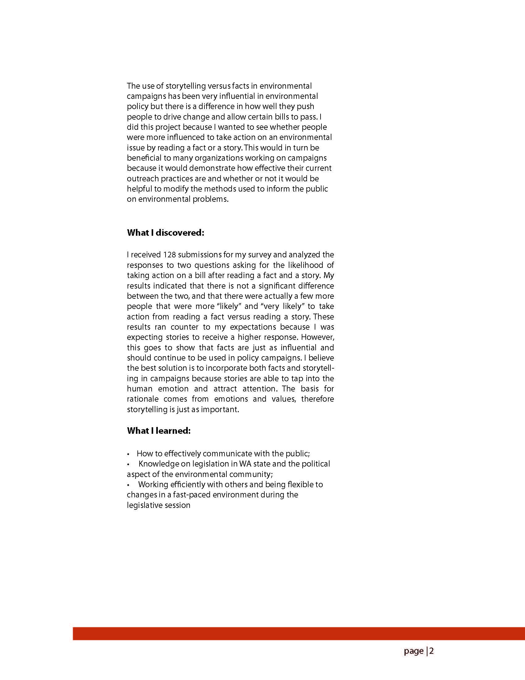 At WEC, I worked as an outreach intern on a priority to increase oil transportation safety. The messages used to inform the public was very fact-driven, and I decided to see if there was a different means of communication that could be used to grab people’s attention. I conducted an online survey and administered it to UW students on Facebook and volunteers from WEC. The purpose was to determine whether there is a difference between reading facts and stories in influencing people to take action on environmental issues.