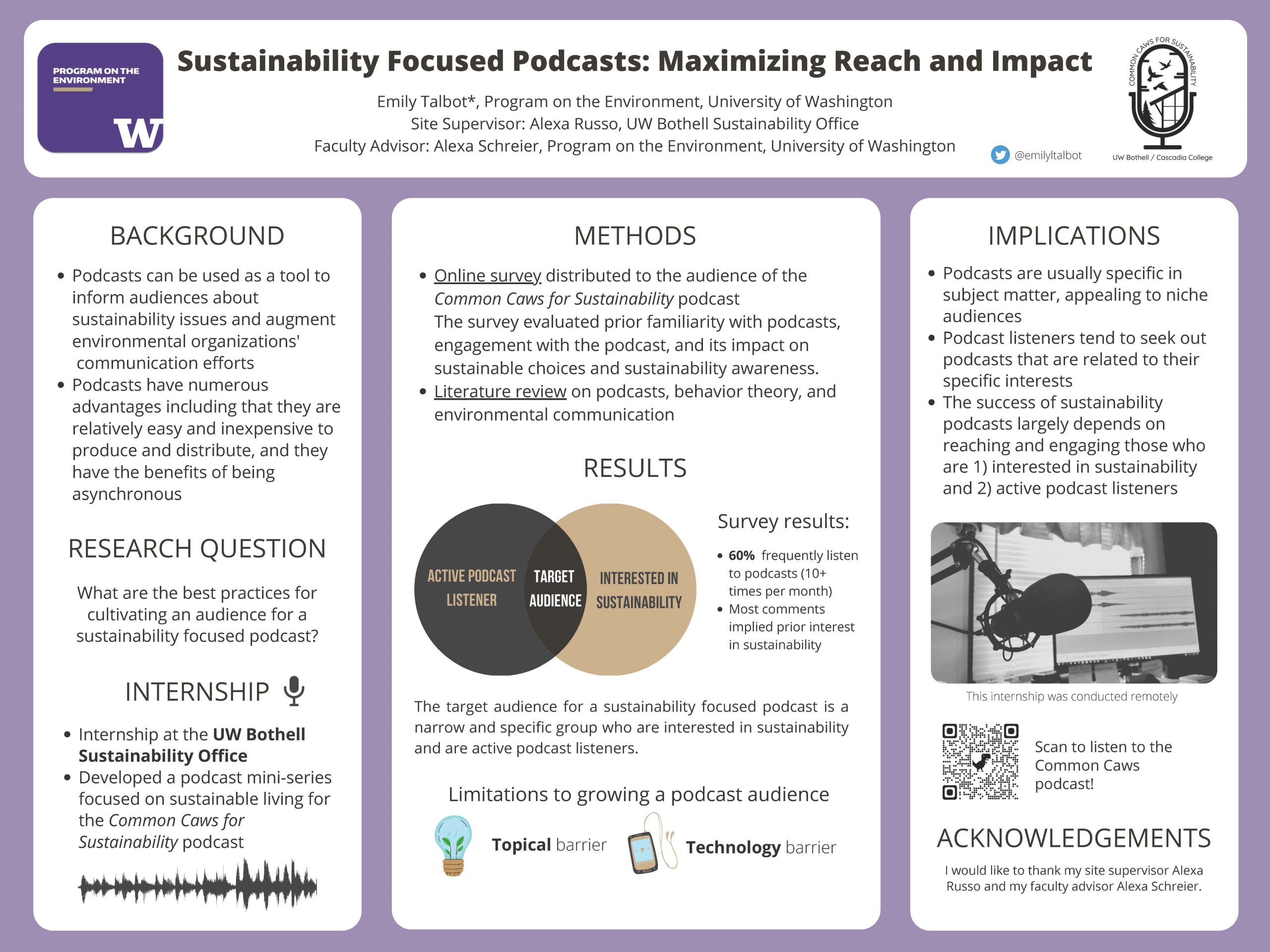 Podcasts can be used as a tool to inform audiences about sustainability issues and augment environmental organizations’ communication efforts, but they are only as impactful as their audience reach. The aim of this study was to characterize the target audience of a sustainability focused podcast and to distill best practices for engaging the audience and maximizing impact. To accomplish this task, I interned at the UW Bothell Sustainability Office where I took part in producing the Common Caws for Sustainability podcast. To address my research question, I administered an online survey to the listeners of the podcast. I also conducted a literature review on educational podcasts, environmental communication, and behavior theory related to sustainability. The findings revealed two barriers to growing a podcast audience: the topical barrier and the technology barrier. The target audience for a sustainability focused podcast was identified as individuals who are active podcast listeners and are interested in sustainability. As podcasts continue to grow in popularity and use, there is an increasing opportunity to reach audiences who are interested in sustainability through this medium. Overcoming barriers to reaching audiences is necessary in order to maximize the positive impact that sustainability focused podcasts have on people’s awareness about sustainability and engagement with environmental organizations.