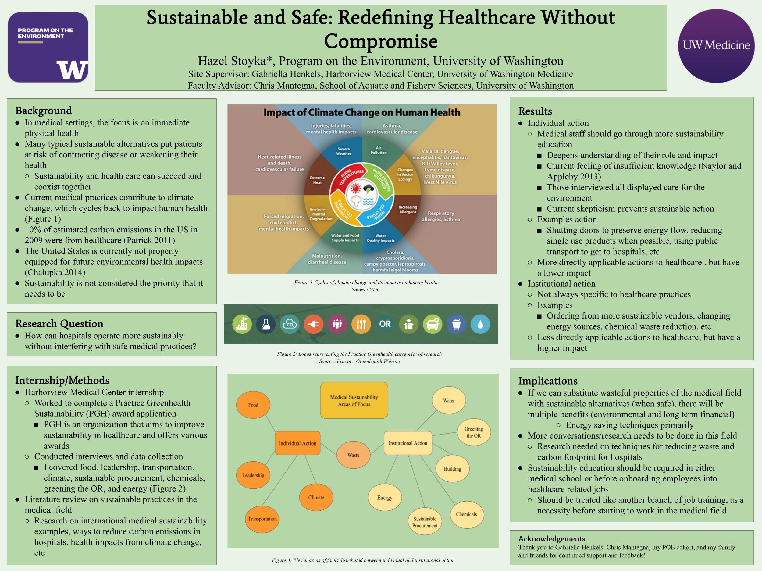 Medical professionals take an oath to put forward efforts to better the care of patients, while simultaneously participating in an industry that emits high levels of greenhouse gas emissions. These emissions cause various adverse health effects, combatting the very promise they are committing to. This hypocrisy was brought to my attention during an interview I conducted last quarter through my internship. At Harborview Medical Center, I learned about the ways in which hospitals are contributing to greenhouse gases. My job was to work with my supervisor to complete an application for a sustainability award (Practice Greenhealth Award) given to hospitals operating in a more sustainable manner. My work was done through data collection, primarily with interviews. While completing this, we looked at eleven areas – buildings, chemicals, climate, energy, leadership, greening the operating room, sustainable procurement, transportation, waste, and water. The goal through my internship and personal research was to determine different ways that the medical field can be simultaneously beneficial to the planet and the people of the planet. Through my efforts I have found that teaching sustainability through the medical curriculum, receiving patient input, and focusing on sustainable resources are some of the many methods that we can use to reduce the carbon footprint of the large contributor that is the medical field. With these strategies, more hospitals can put forth their best efforts to align with sustainability. Medical health and environmental health can exist mutually and one does not need to decrease for the benefit of the other.