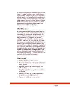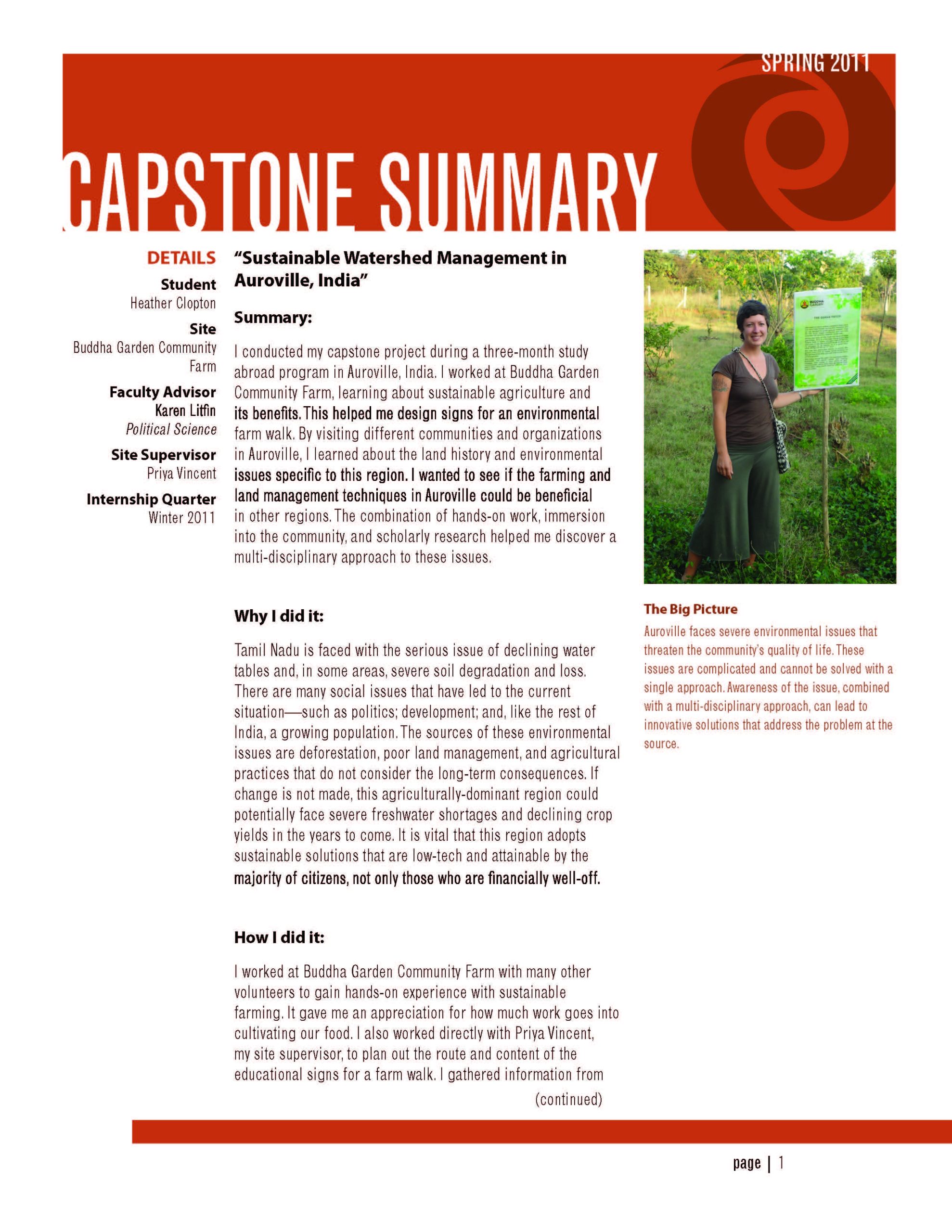 I conducted my capstone project during a three-month study abroad program in Auroville, India. I worked at Buddha Garden Community Farm, learning about sustainable agriculture and its benefits. This helped me design signs for an environmental farm walk. By visiting different communities and organizations in Auroville, I learned about the land history and environmental issues specific to this region. I wanted to see if the farming and land management techniques in Auroville could be beneficial in other regions. The combination of hands-on work, immersion into the community, and scholarly research helped me discover a multi-disciplinary approach to these issues.