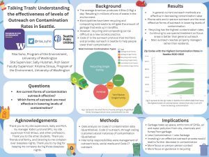 Seattle Public Utilities have been managing the composting and recycling services in the city for years, but there is still a massive amount of waste that could be recycled or composted. If 10% or more of a bin has materials that don’t belong to the bin, such as garbage in a recycling bin the recycling bin will not be recycled, and contents will be dumped in a landfill. When wrong materials are discarded into the wrong bin, this is then considered a contamination. To minimize levels of contamination in Seattle, Seattle Public Utilities developed the Code 17 program. This program is different forms of outreach from letters, oops tags, phone calls and if needed in-person inspections. However, we need to monitor if these efforts were successful in the goal of reducing levels of contamination over time. General results support that outreach efforts do aid in reducing levels of contamination. Through the data analysis and qualitative experience, we have learned there are areas of improvement such as focusing on certain zip codes and identifying if current methods are effective. In order to minimize this issue, we must improve people’s access to information and resources by evaluating the current effectiveness of current public outreach strategies.