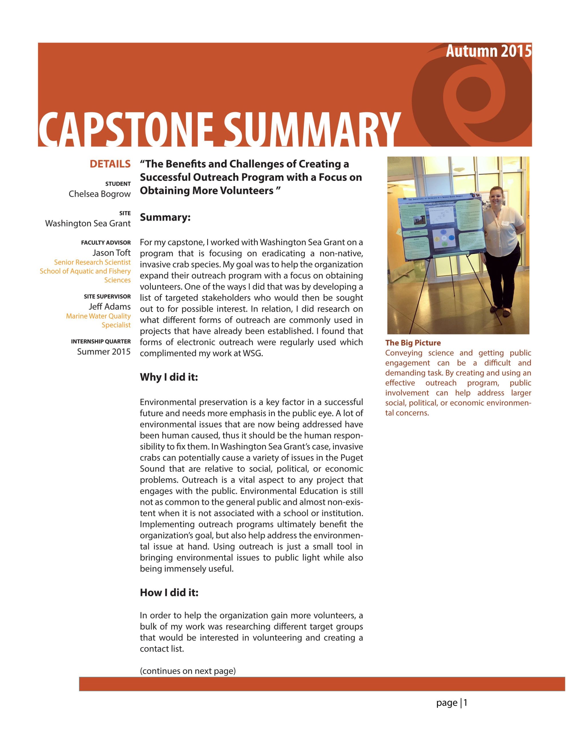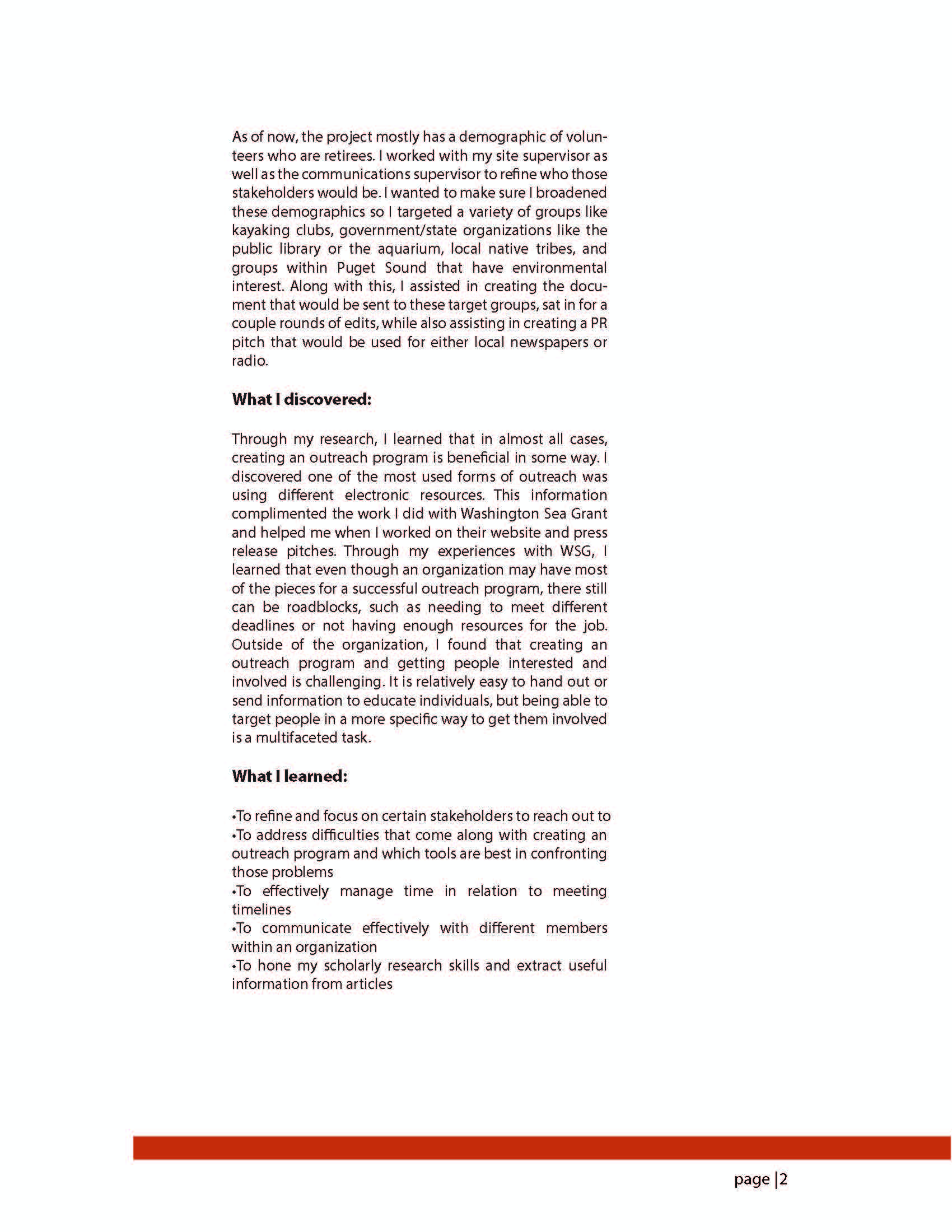 For my capstone, I worked with Washington Sea Grant on a program that is focusing on eradicating a non-native, invasive crab species. My goal was to help the organization expand their outreach program with a focus on obtaining volunteers. One of the ways I did that was by developing a list of targeted stakeholders who would then be sought out to for possible interest. In relation, I did research on what different forms of outreach are commonly used in projects that have already been established. I found that forms of electronic outreach were regularly used which complimented my work at WSG.
