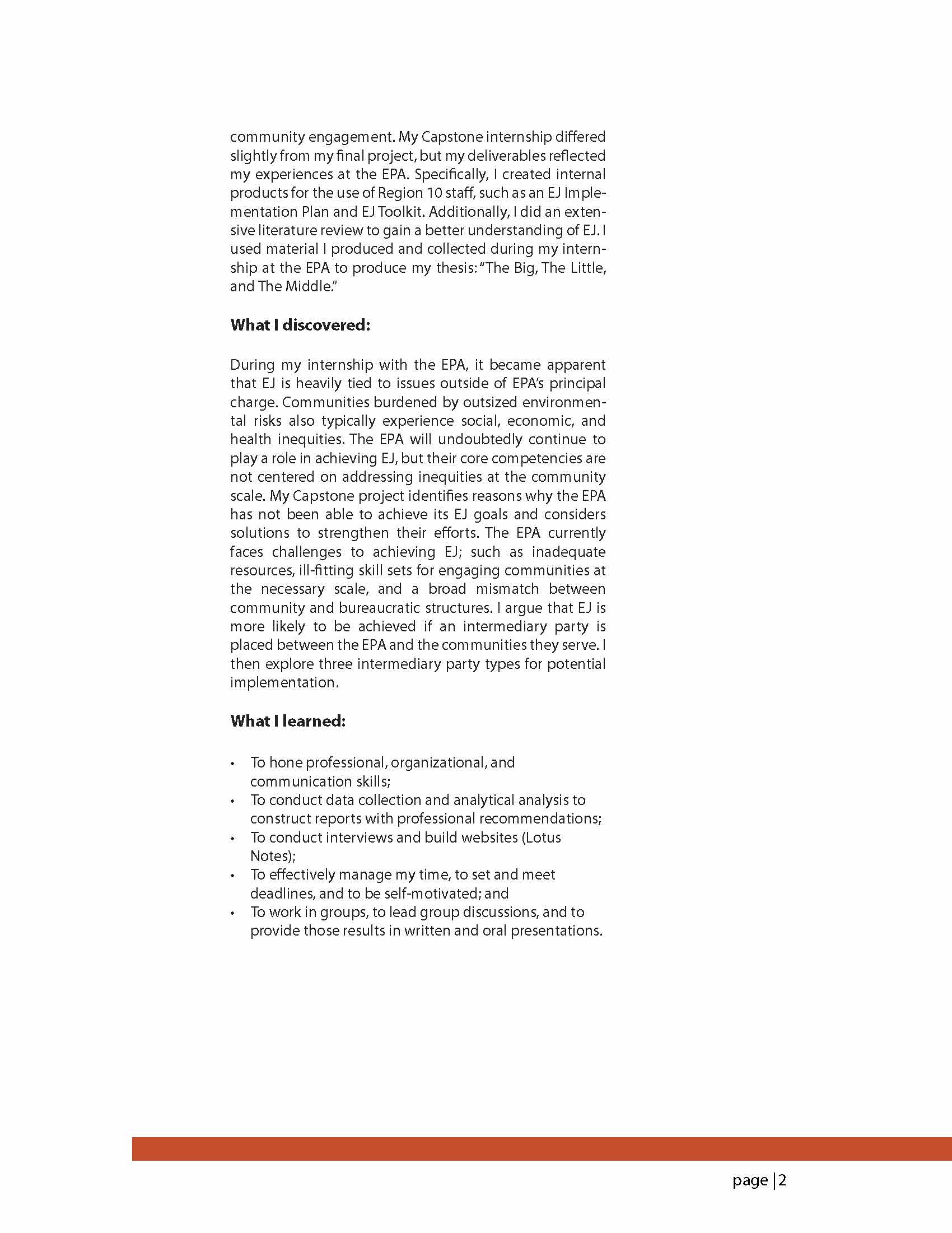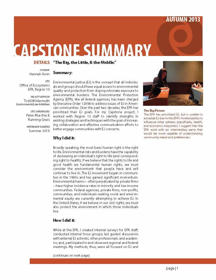 Environmental justice (EJ) is the concept that all individuals and groups should have equal access to environmental quality and protection from disproportionate exposure to environmental burdens. The Environmental Protection Agency (EPA), like all federal agencies, has been charged by Executive Order 12898 to address issues of EJ in Ameri- can communities. Over the past two decades, the EPA has prioritized their EJ goals. For my Capstone project, I worked with Region 10 staff to identify strengths in existing strategies and techniques with the goal of increasing collaboration and effective communication efforts to better engage communities with EJ concerns.