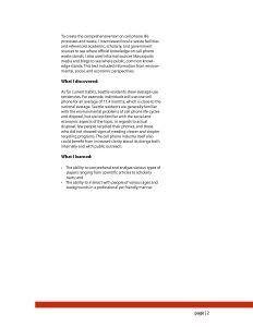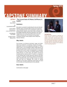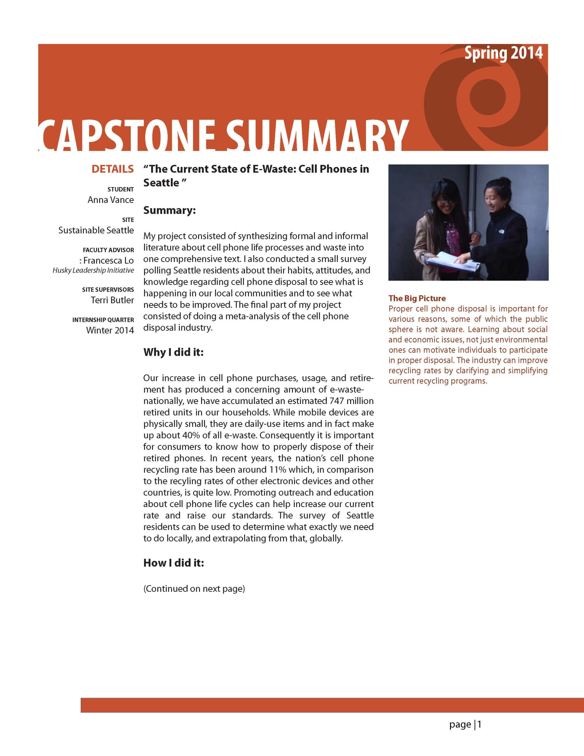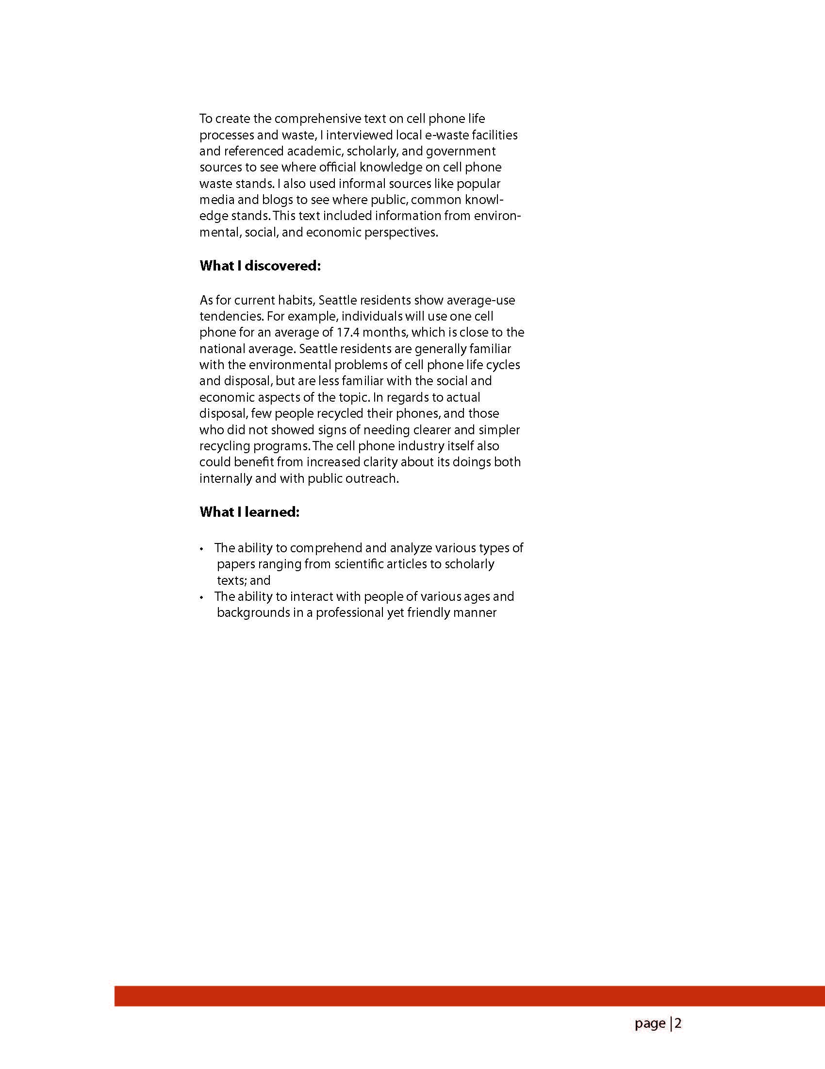 My project consisted of synthesizing formal and informal literature about cell phone life processes and waste into one comprehensive text. I also conducted a small survey polling Seattle residents about their habits, attitudes, and knowledge regarding cell phone disposal to see what is happening in our local communities and to see what needs to be improved. The final part of my project consisted of doing a meta-analysis of the cell phone disposal industry.