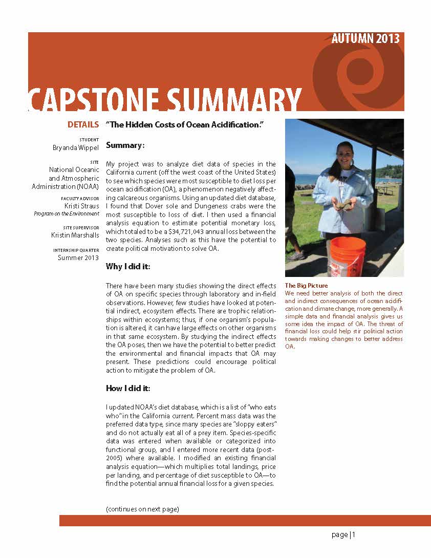 My project was to analyze diet data of species in the California current (off the west coast of the United States) to see which species were most susceptible to diet loss per ocean acidification (OA), a phenomenon negatively affect- ing calcareous organisms. Using an updated diet database, I found that Dover sole and Dungeness crabs were the most susceptible to loss of diet. I then used a financial analysis equation to estimate potential monetary loss, which totaled to be a $34,721,043 annual loss between the two species. Analyses such as this have the potential to create political motivation to solve OA.