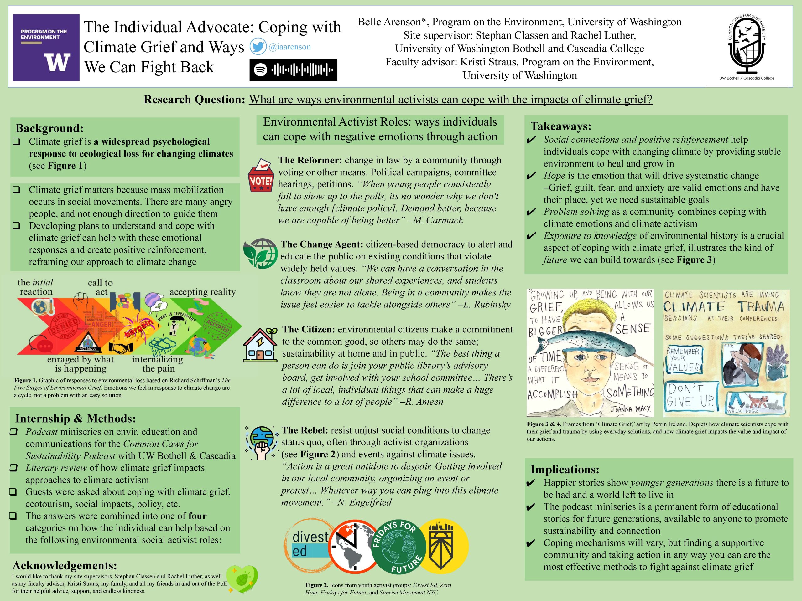 The development and implementation of community-based support plans to cope with strong climate related emotions is a crucial aspect of the preservation of individual environmental activism (IEA). The effort to work towards understanding emotional responses and reactions to the changing climate creates the opportunity to reframe a person’s emotional response to climate change. More than two thirds of American adults said they had experienced ‚eco-anxiety, which can potentially be both debilitating and motivating for the general public to take action towards environmental issues. The in-depth analysis and discussion of action plans for individual advocates is conducted with the aim to gain a more comprehensive understanding of how to improve environmental activism as a concept so it is more inviting and navigable for those struggling with climate-focused mental health issues. During my work assisting the UW Bothell and Cascadia Colleges as a podcast host for the Common Caws for Sustainability Podcast, I was able to gather relevant data from several environmental experts throughout the podcast miniseries. To accomplish this, I interviewed each subject on the same two questions at the end of the interview for continuity, emphasizing themes of community, local politics, and how a person should take care of their mental wellbeing. With this information, I was able to conclude that above all, the ability to stay hopeful is the most valuable. The tenacity of human nature will not surpass the longevity of climate grief, but last alongside it, as grief is not linear and neither is our lived experience.