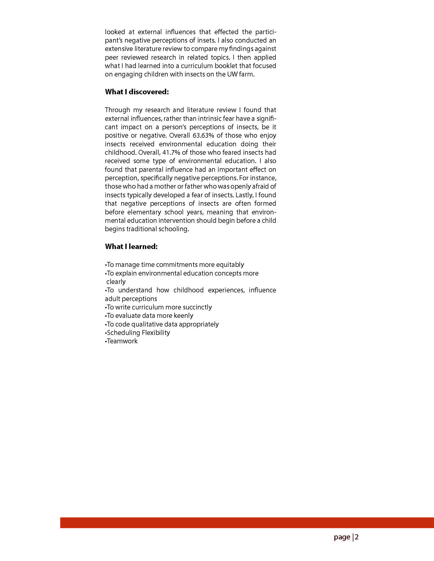 During this project, I worked at the UW farm in an attempt to understand why certain people develop negative perceptions of insects. Specifically, I looked at the discomfort and fear associated with insects and how our perceptions of them hinder a positive outdoor experience. Using a survey I looked at external influences during childhood that informed adult perceptions of insects, and how we might alter environmental education to build positive perceptions rather than negative ones. I found that early environmental education intervention had the most significant impact on a person’s positive and negative perceptions of insects.