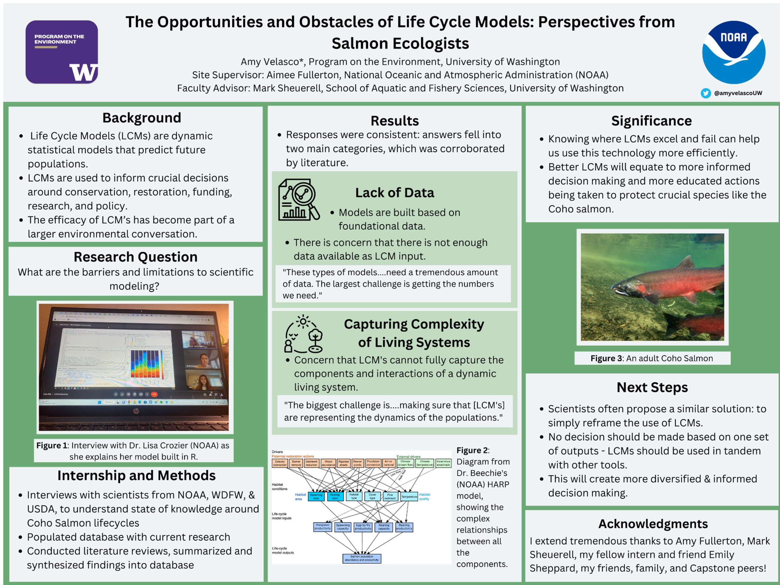 The Life Cycle Model (LCM) is a tool used by NOAA and other groups to predict populations in the face of changing environmental conditions, and these population estimates are often used to inform conservation, restoration, and policy decisions. These models inherently come with some degree of unreliability, and awareness of the challenges that come with modeling can help all users make better judgments and more informed decision making. The aim of this study was to understand where LCMs begin to fail us based on direct opinions of the very scientists that create and use these models. In this internship, I conducted expert interviews with scientists from NOAA, WDFW, USDA, and others to understand the current state of knowledge surrounding salmon ecology, and how LCMs have helped and hindered that progression of knowledge. I then worked to construct and populate a database through which current research and LCMs are synthesized and summarized. Through the interviews, I identified two major categories of concern: lack of data to inform models (likely attributed to underfunding as well as logistical issues of studying live organisms), as well as potential inability to capture the complexity of dynamic living systems. Being educated and understanding the opportunities and obstacles of LCMs can help us use this technology more efficiently. Moving forward, scientists largely agree that LCMs are undoubtedly extremely valuable, just potentially one part of a broader system of tools that can work together to promote more informed decision making.