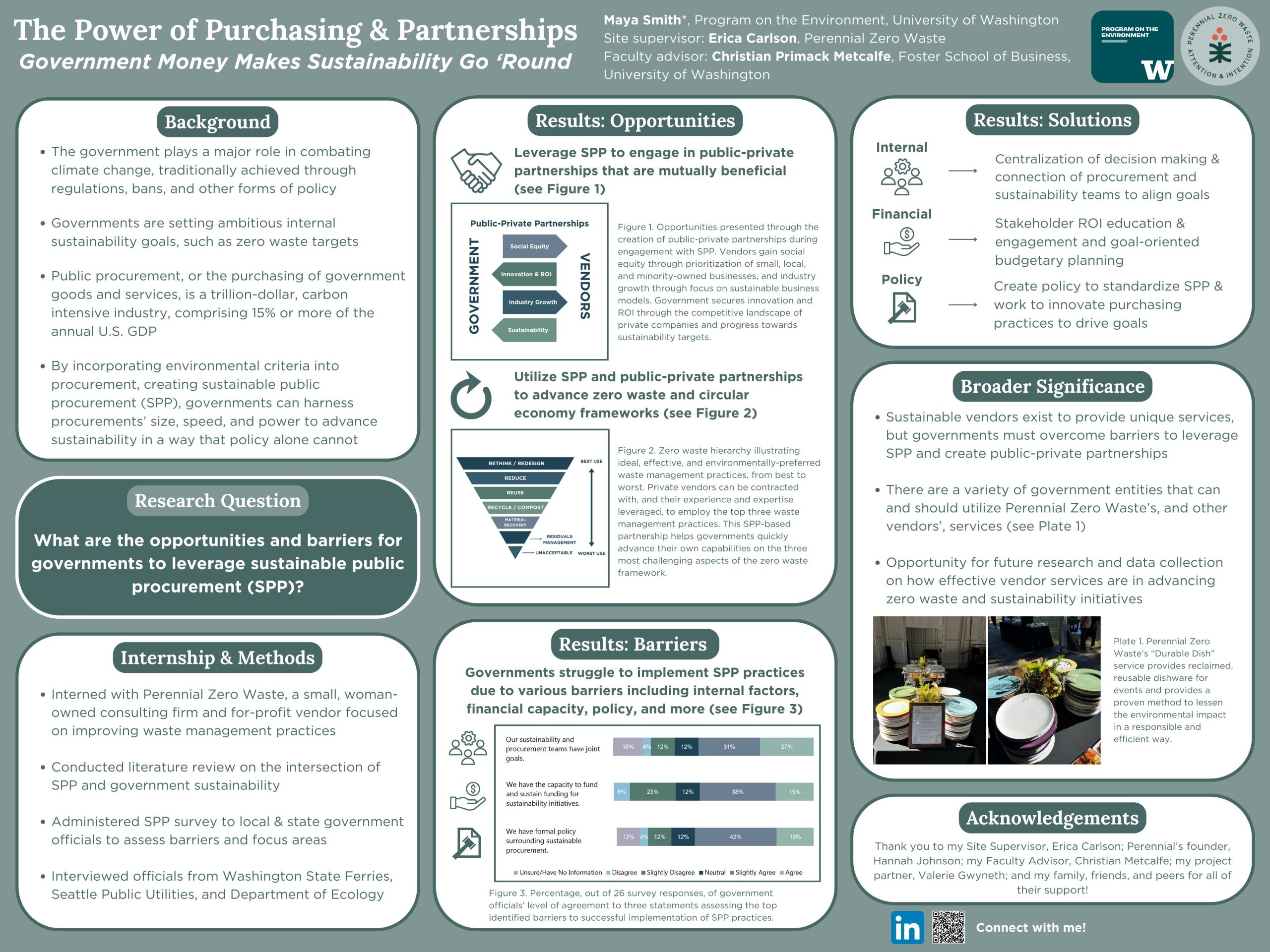 Government procurement is a trillion dollar industry with a high carbon footprint, yet it holds the potential to combat climate change in a unique way that policy alone cannot. U.S. governments are setting aggressive sustainability goals and focusing on policy implementation, but have struggled to improve internal operating sustainability. This study aims to identify the opportunities and challenges associated with leveraging procurement to facilitate sustainability. To accomplish this task, I interned with Perennial Zero Waste and collected data on topics of sustainability, procurement, and zero waste through surveys and interviews of government officials. Additionally, I conducted a literature review of current opportunities and barriers around sustainable public procurement (SPP), as well as its potential to achieve zero waste goals and engage with vendors. Findings indicate that SPP is an avenue to create public-private partnerships (PPPs) for the benefit of sustainable government operations and improved waste management, advancement of social initiatives, and growth of green industries, yet it remains underutilized in the U.S. due to various barriers. Through internal policy creation, stakeholder engagement, innovation, and use of available resources, barriers can be overcome to realize the numerous benefits SPP has to offer. These findings are significant to my host organization because there are opportunities for their various environmental services to be utilized in the government sector through a PPP that benefits both parties substantially. Understanding the potential of SPP to enhance sustainability efforts will allow for governments to improve operations by engaging with vendors like Perennial Zero Waste.