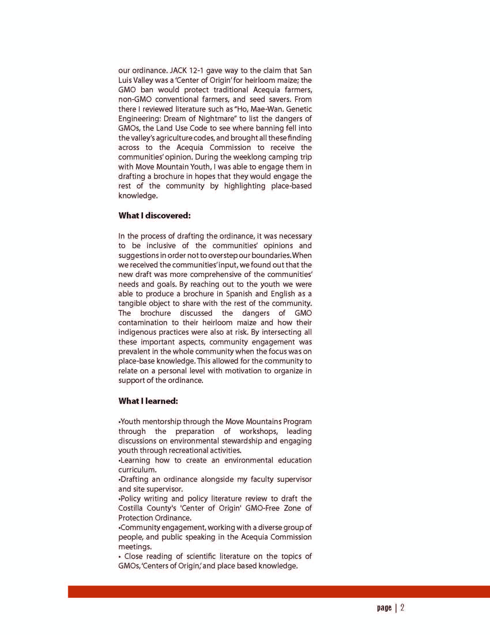 My internship was located in the San Luis Valley, containing some of the oldest and sustainable agricultural practices that protect heirloom maize landraces. My results highlighted that by connecting the communities’ input for the Costilla County’s ‘Center of Origin’ GMO-Free Zone of Protection Ordinance, and engaging the Move Mountains Youth, I was able to engage the entire community as long as the project related back to place-based knowledge. This is important because San Luis can be seen as a model to other “Center of Origins” wanting to ban GMOs, for equitable food systems, and for biodiversity.