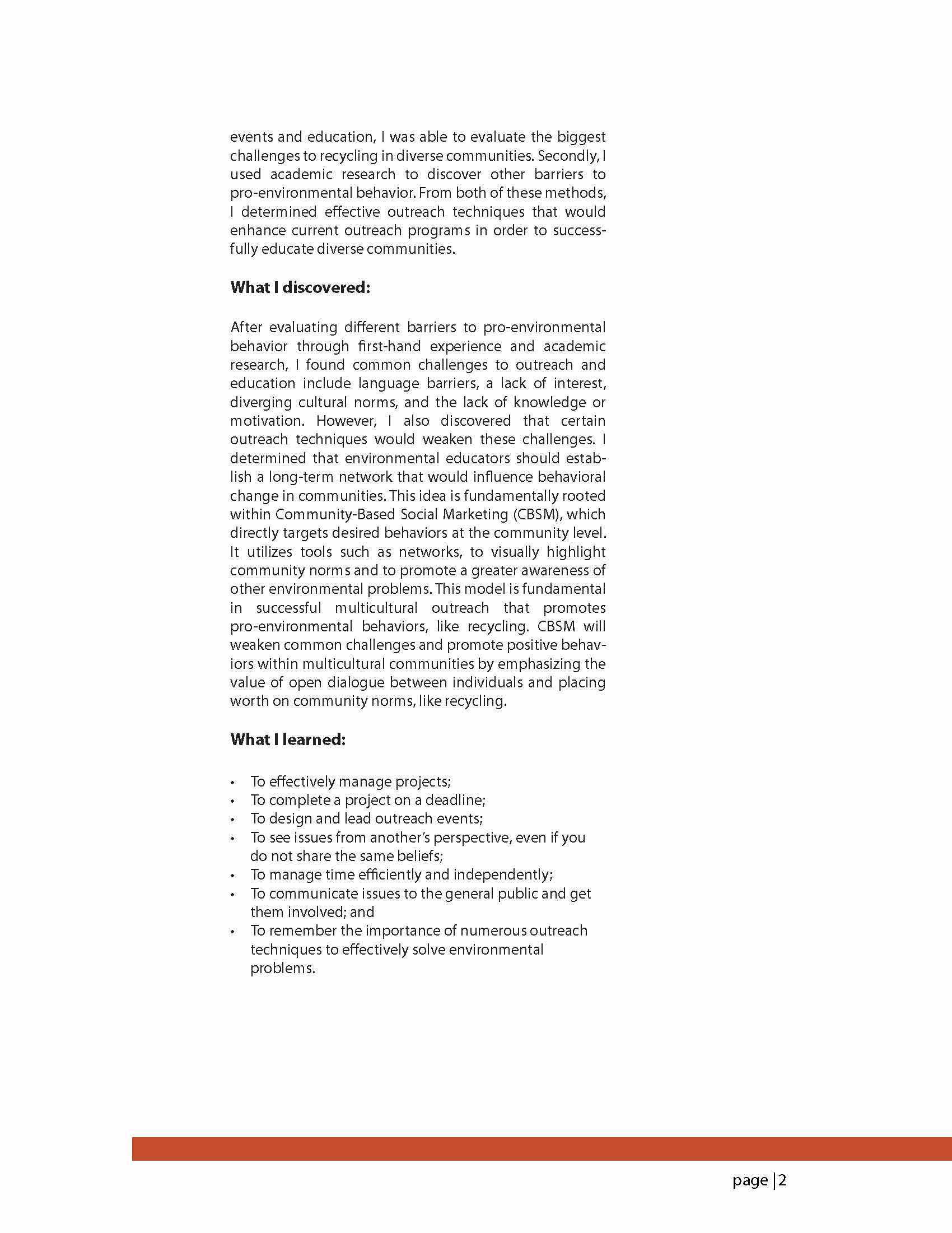 During my internship with CleanScapes, I worked with the Waste Diversion department to enhance outreach and education. I was able to assist in community events ranging from farmers’ markets to kids’ camps. I also helped in educating multifamily apartments about recycling and composting—handing out free recycling bins and educational flyers. I also wrote weekly waste tips that were published online for customers and I called 1000+ customers to ask if any educational assistance was needed. It is important to discern what challenges are present when educating a community and what can be done to remedy those issues to better promote environmental stewardship.