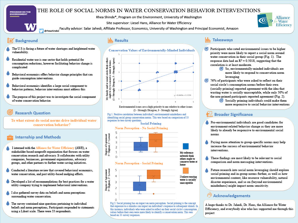 The U.S is facing a future of water shortages and heightened water vulnerability. Residential water use is one sector that offers potential for consumption improvements; behavior change interventions offer a new way forward in these efforts. Since behavior change has a large social component, the aim of this research was to understand how social norms impact the ways in which individuals think about water conservation. The internship portion of this project was completed with the Alliance for Water Efficiency and consisted of creating a literature review on applications of behavioral economic principles to water conservation efforts and constructing a list of recommendations on which principles were most applicable to the task. This research was supplemented by a survey designed to eke out Greater Seattle Area residents’ perceptions and opinions about water use norms and behaviors. Water use social norms were found to be most prevalent to people already environmentally inclined. Additionally, people who report taking conservation actions around their home are also more likely to perceive conservation norms. Lastly, socially priming individuals made them more likely to perceive conservation norms. These results are significant in guiding how to choose the type of behavior interventions that will be most impactful in a given population. It also highlights the importance of paying attention to in-group norms when designing behavior interventions. For example, social comparisons are more likely to lead to decreases in water consumption in environmentally friendly areas, while more specific in-group norms may need to be leveraged for less pro-environment populations.