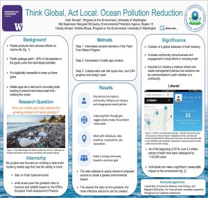The Pacific garbage patch is an example of the several swirling garbage zones in the oceans where all kinds of trash – including plastics, glass bottles, cigarette butts, and mattresses – end up. Both microplastics and whole plastic products have adverse effects on marine life. Reports suggest that 80% of microplastics in the gyres come from land-based activities, while the rest come from items that are lost or thrown overboard from ships. Garbage in the ocean come from trash from trash cans, the streets, and landfills that gets blown into sewers, rivers, or directly into the ocean. The purpose of this study was to create a mobile application with an ability to collect data on trash types, amounts, or what areas pose the greatest risks to humans and wildlife. This will support the Environmental Protection Agency’s (EPA) Trash Free Waters (TFW) Program to have a usable product that will increase the ability to track trash during site cleanup. To accomplish this task, I utilized my connections within several mobile application creators to be able to gather input on good practices for mobile experience design. I also utilized my connections with the members of TFW Program to ensure that its goals and needs in trash tracking are considered. The resulting mobile app provides an easy-to-use methodology for identifying a cleanup site, picking up the trash, and cataloguing it in a way that produces reliable data on the characteristics of trash as well as potential threats posed by waste.