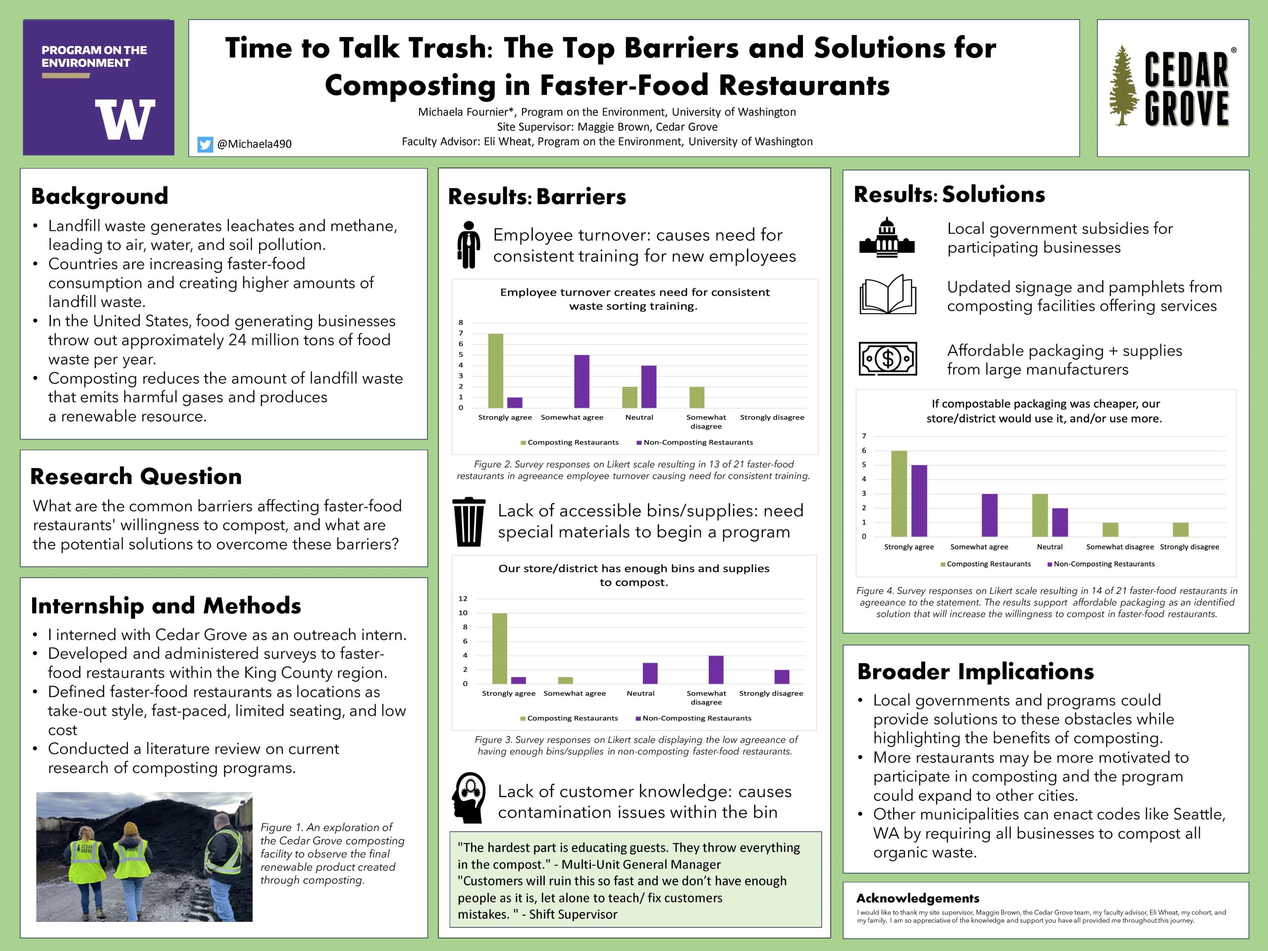 With the growing consumption of faster-food in King County, the surrounding landfills are filling quickly and releasing large amounts of methane and carbon dioxide into the atmosphere. With a successful composting program implemented, food waste can be diverted from landfills, helping both public and environmental health. The aim of this study is to identify the barriers and solutions of composting in faster-food restaurants to help implement more successful composting programs. The research was conducted through the distribution of a 33-question survey by email, phone, and in-person outreach that was completed by 21 composting and non-composting restaurants throughout King County. To collect more evidence to support the survey results, a literature analysis was completed to draw comparisons to similar data in other cities and counties with comparable populations and regulations to King County. The key findings show that the most prominent barriers are the lack of knowledgeable customers, the need for regular staff training on waste sorting, employee turnover, and the lack of accessible bins, supplies, and updated signage. The most prominent strengths exhibited for both composting and non-composting restaurants include an environmentally friendly image for the store/district/company, cost savings, knowledgeable staff, and reduced environmental impact. This research can facilitate work between composting facilities and local governments to devise methodologies that will assist faster-food restaurants in surmounting barriers to composting. Furthermore, it aims to promote the benefits of composting to commercial entities and decrease the negative environmental effects.
