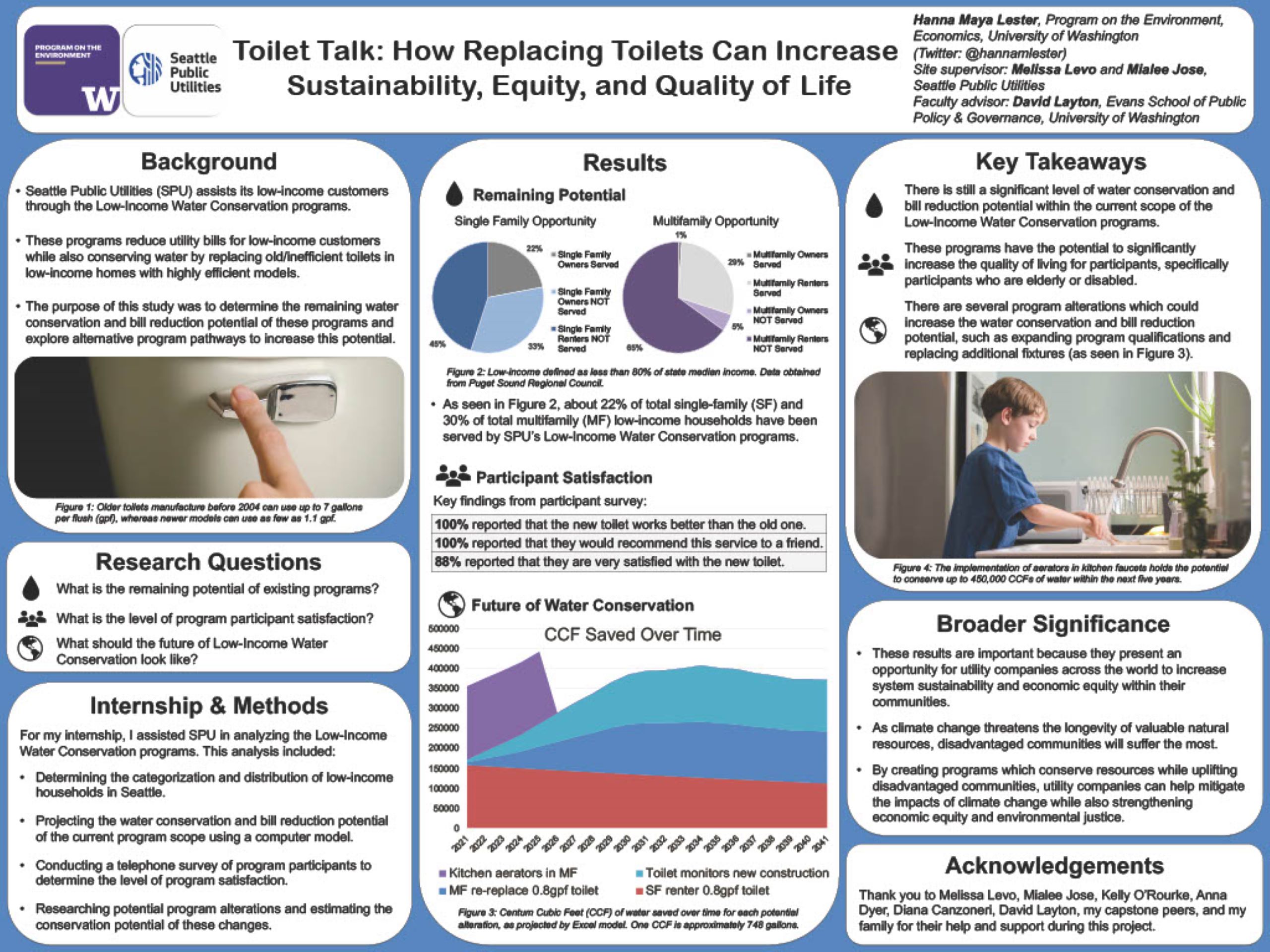 At the intersection of system sustainability and economic equity, Seattle Public Utilities (SPU) assists its customers through Low-Income Water Conservation Programs. These programs aim to reduce utility bills for low-income customers while also conserving the city’s water supply by replacing old and inefficient toilets in low-income homes with newer and highly efficient models. However, program participation has been rapidly declining in recent years. In order to continue its mission of assisting low-income customers while also conserving water, SPU must analyze these programs and decide whether or not they are achieving their objectives. The purpose of this study was to determine the remaining water conservation and bill reduction potential of these programs, and to explore other program pathways which may increase this potential. To accomplish this task, I helped build a functional model with the ability to project the conservation and bill reduction potential of various measures across several years. I also conducted a telephone survey of program participants in order to determine customer satisfaction. My findings suggest that these programs not only have remaining potential to save money and water, but can also significantly increase the quality of living for participants. Additionally, there are several program pathways available which can greatly increase this potential. These results imply a major opportunity for city governments to increase the long-term system sustainability of their natural resources while also promoting economic equity and increased living standards within their communities.