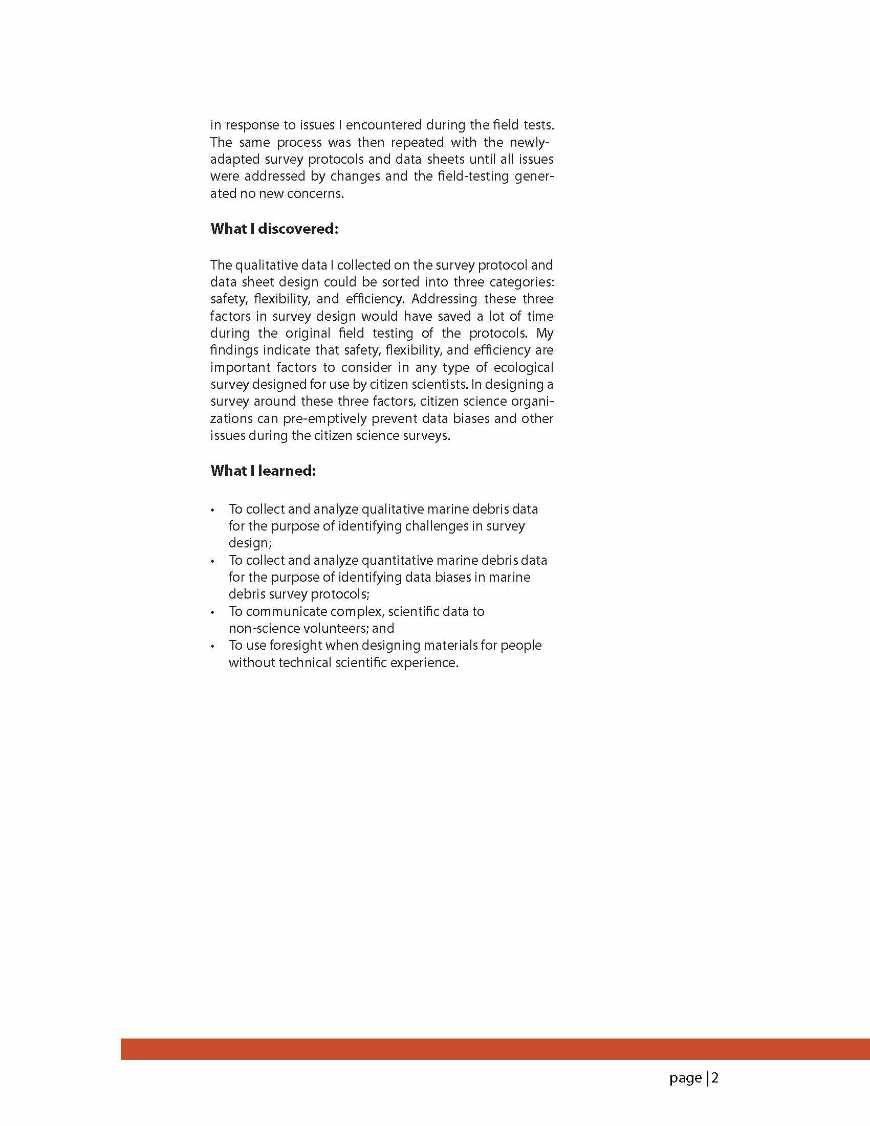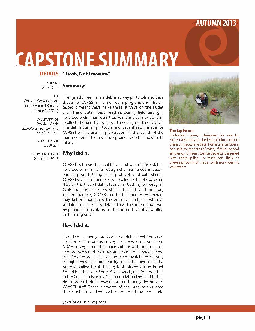 I designed three marine debris survey protocols and data sheets for COASST’s marine debris program, and I field- tested different versions of these surveys on the Puget Sound and outer coast beaches. During field testing, I collected preliminary quantitative marine debris data, and I collected qualitative data on the design of the surveys. The debris survey protocols and data sheets I made for COASST will be used in preparation for the launch of the marine debris citizen science project, which is now in its infancy.