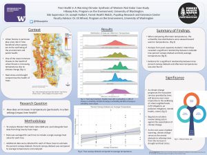 Urban tree health is imperative to the overall functioning of the diverse ecosystem that is the urban environment. With climate change increasing in severity causing temperatures to rise, research on the impact of heat on urban trees is pivotal as we aim to keep communities and ecosystems healthy and balanced. My internship with the Forest Health Watch program focused on work performed by Dr. Joseph Hulbert, University of Washington capstone students (Angela Gaither and Lyndsay Felthoven) and community scientists on heat related impacts to the Western Red cedar. The coniferous tree is native to the Pacific Northwest and holds deep cultural ties to the state of Washington, thus making it the focus of the studies research efforts. During the study the health of 382 trees were measured within areas of King County Washington where air temperatures were estimated through a heat mapping effort (these measurements were conducted by 56 community scientists). Additionally, one-hundred and ten randomly selected street trees in Seattle and Renton were also visited to estimate the percent canopy dieback (these estimates were performed by Dr. Joseph, Angela Gaither and Lyndsay Felthoven). Distribution of temperature data were most distinct between health classes in the afternoon with the exception of trees that were dead. A positive linear relationship was noted between percent canopy dieback and average temperatures. These results indicate the benefits that communities receive from redcedar trees may be reduced by warming temperatures. Benefits such as their ability to mitigate the effects of urban heat islands, improve mental health, and even decrease urban crime rates