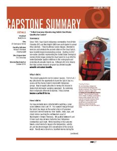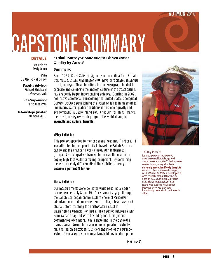 Since 1989, Coast Salish indigenous communities from British Columbia (BC) and Washington (WA) have participated in annual tribal journeys. These traditional canoe voyages, intended to exercise and celebrate the ancient culture of the Coast Salish, have recently begun incorporating science. Starting in 2007, non-native scientists representing the United States Geological Survey (USGS) began joining the Coast Salish to in an effort to understand water quality conditions in this ecologically and economically valuable inland sea. Although still in its infancy, the tribal journey research program has yielded tangible scientific and cultural benefits.