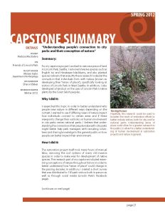 For my capstone project I worked to restore a piece of land in Lincoln Park, Seattle. I removed invasive species such as English ivy and Himalayan blackberry, and also planted species native to that area. My thesis research looked at the connection that individuals form with nature (known as developing their “sense of place”), specifically looking at visitors of Lincoln Park in West Seattle. In addition, I also developed a handout on the uses of Lincoln Park’s native plants by the Coast Salish peoples