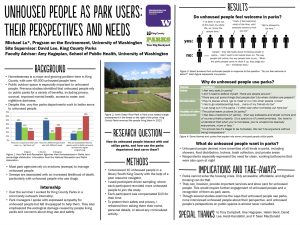 Unhoused people are intensive users of parks in King County, but their needs are rarely considered by parks departments as they are not seen as “legitimate” users. There are also few studies on unhoused people and parks that focus on the perspectives of unhoused people themselves. This study tries to reposition unhoused people as park users in order to understand how and why unhoused people use parks, as well as what parks can do to improve their experience. Through my internship at King County Parks, I learned that unhoused park visitors sometimes come into conflict with park employees and that some park managers feel ill-equipped to serve unhoused people who frequent their park. To include perspectives of unhoused people, I surveyed ten unhoused people in south King County and analyzed their responses for themes. I found that they use parks to aid in socialization and safety, and because of hostility elsewhere. However, they still feared judgement by housed park users and harassment from police. The surveyed unhoused people also desired open, well-maintained public restrooms, showers, lockers, and other public amenities in parks. Though parks cannot solve King County’s housing crisis, these findings show that unhoused people are already using parks for a variety of reasons, and thus parks are in a unique position to provide important amenities that can improve people’s lives, if park departments are willing to reach out to them.