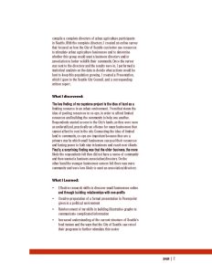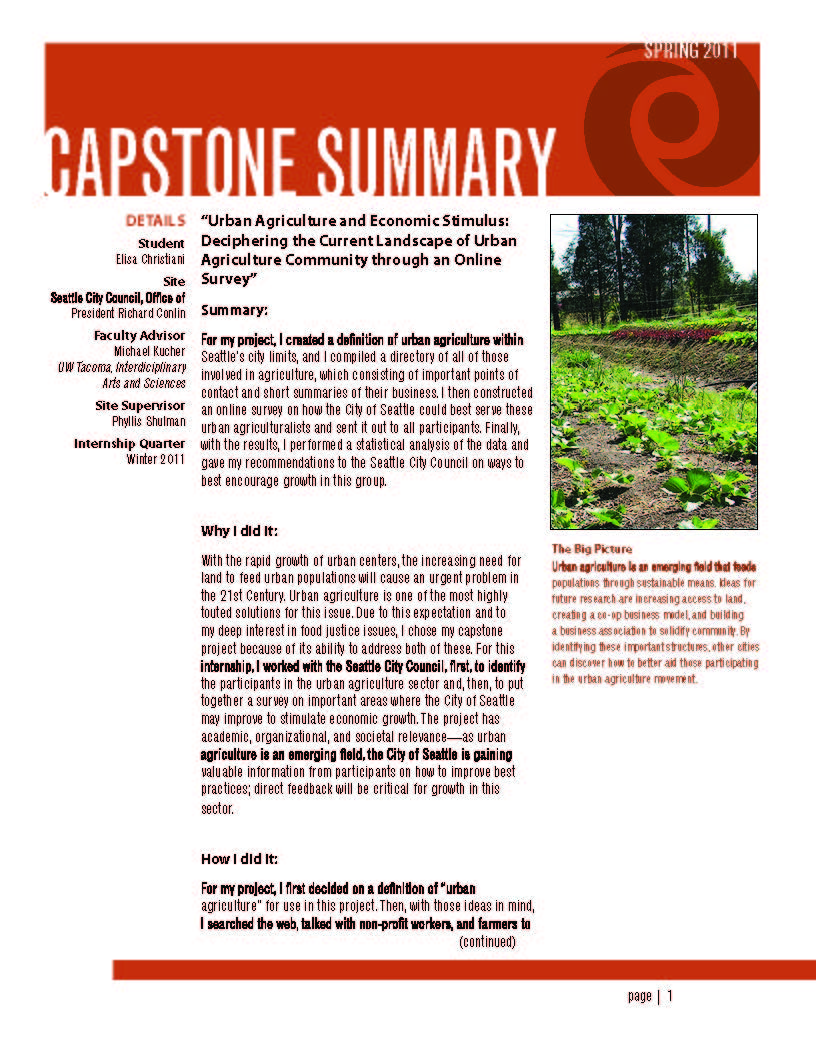 For my project I created a definition of Urban Agriculture within Seattle’s city limits, and I compiled a directory of all of those involved in agriculture, which consisting of important points of contact and short summaries of their business. I then constructed an online survey on how the City of Seattle could best serve these urban agriculturalists and sent it out to all participants. Finally, with the results, I performed a statistical analysis of the data and gave my recommendations to the Seattle City Council on ways to best encourage growth in this group.