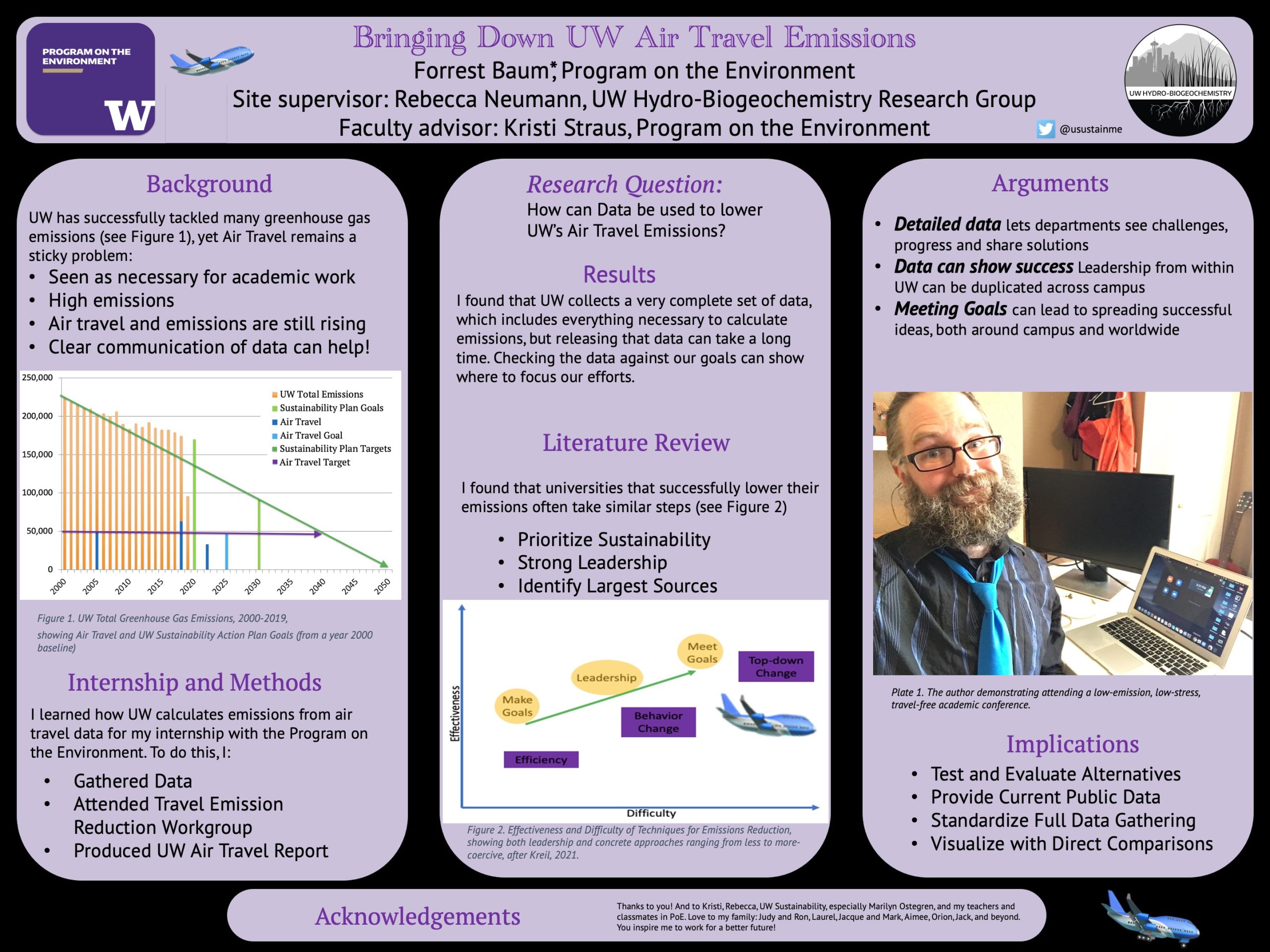 Emissions from air travel are expected to keep rising – making them an important problem to tackle. Universities must find a way to lower their air travel emissions, while still finding a way to perform necessary work that has depended upon air travel. The aim of this work was to understand how UW gathers data to calculate emissions from air travel and use that data to lower emissions. I was connected to UW Sustainability, and with their backing and suggestions, I contacted UW groups to collect flight and emissions data. I also conducted a literature review to research what methods other universities had found effective. A more detailed understanding of our air travel can help lead to both better efficiency in the short term, and knowledge of which big choices may need to be made. Improved data can help understand which next steps will be both most consequential and most effective. A breakdown of which departments are responsible for what number of emissions allows us to make goals and track progress over those smaller groups. This lets us see which groups are leading the way, and we can share which methods are most effective. Better data and understanding can both help UW leadership and other departmental groups make decisions. The success stories can also be published to share proven emission reduction methods with other universities eager to put them to use.