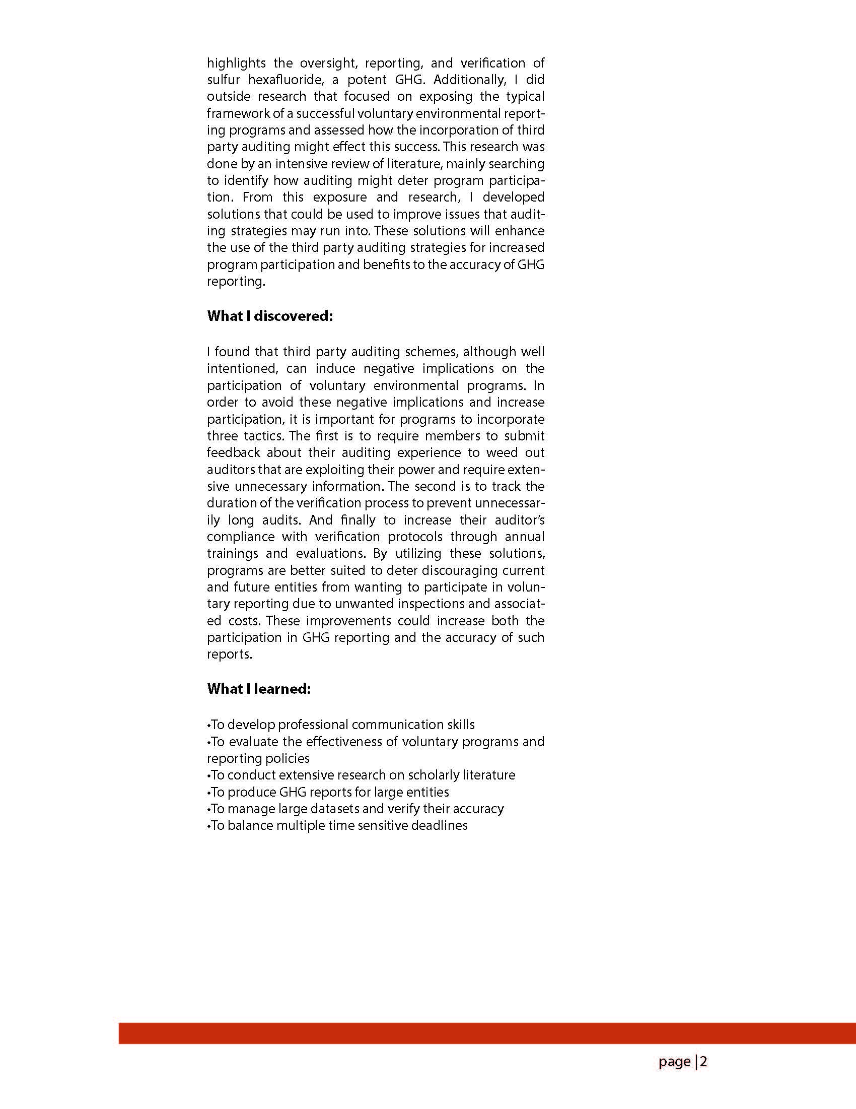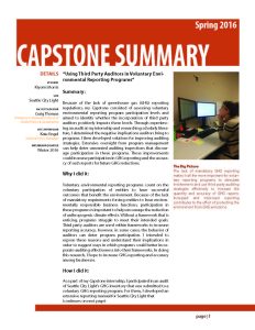 Because of the lack of greenhouse gas (GHG) reporting regulations, my Capstone consisted of assessing voluntary environmental reporting program participation levels and aimed to identify whether the incorporation of third party auditors positively impacts these levels. Through experiencing an audit at my internship and researching scholarly literature, I determined the negative implications auditors bring to programs. I then developed solutions for improving auditing strategies. Extensive oversight from program management can help deter unwanted auditing inspections that discourage participation in these programs. These improvements could increase participation in GHG reporting and the accuracy of such reports for future GHG reductions.