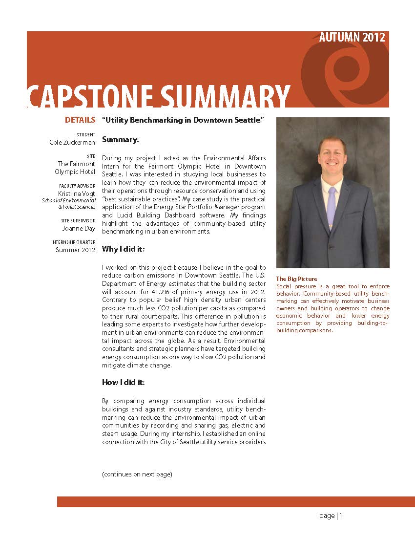 During my project I acted as the Environmental Affairs Intern for the Fairmont Olympic Hotel in Downtown Seattle. I was interested in studying local businesses to learn how they can reduce the environmental impact of their operations through resource conservation and using “best sustainable practices”. My case study is the practical application of the Energy Star Portfolio Manager program and Lucid Building Dashboard software. My findings highlight the advantages of community-based utility benchmarking in urban environments.