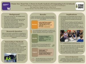 Globally, food waste contributes to roughly 8% of annual greenhouse gas emissions. Implementing a commercial composting program to address the issue of food waste in grade schools presents a unique opportunity to both divert food from the landfill and introduce environmental education topics to students. The aim of this study was to identify the benefits and barriers to composting in a K-12 setting in order to explore methods of supporting schools with commercial compost implementation. I began my research by conducting a literature review, and then created a survey and distributed it to over 300 K-12 schools in various districts across King County. I asked them to identify top barriers and benefits they faced, as well as supports to help them create a successful program. I found that lack of funding and staff time were some of the biggest barriers, and that an increase in environmental awareness amongst students was one of the biggest benefits. Schools reported that having student engagement opportunities and ensuring available funding were the most helpful supports for a successful program. By 2025, HB 1799 will require organic waste in Washington to be diverted from the landfill, meaning that schools will be compelled to compost. If systems of support are not set up before this blanket measure, composting programs will not achieve their highest possible success. I hope that by beginning to identify barriers to commercial composting, we will be one step closer in providing them the support they need to start diverting their food waste.