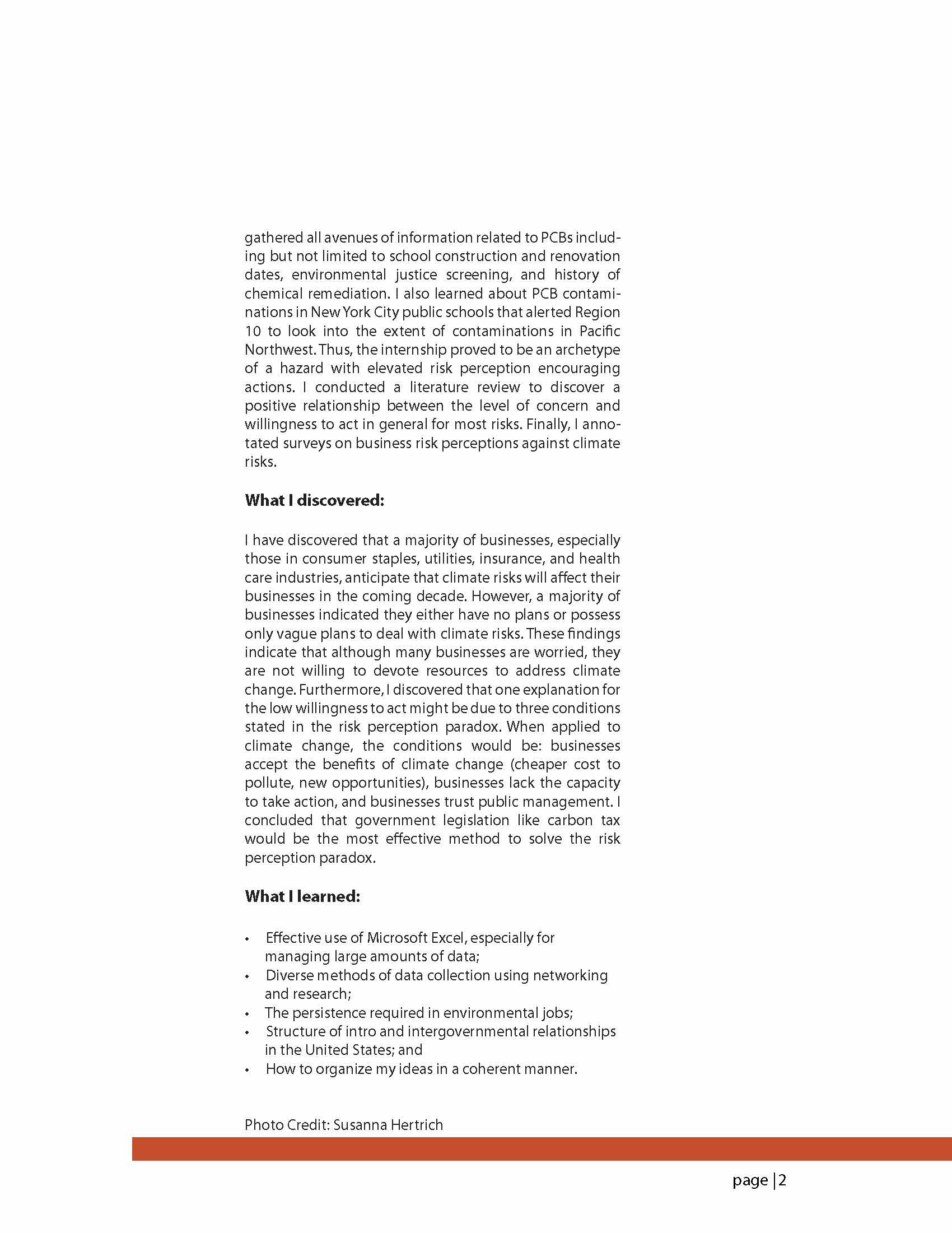 For my internship, I created a database to determine the extent of toxic PCB contamination in school facilities. I learned that PCBs are associated with elevated risk perception; they make many people disproportionately concerned and encourage people to take action. In response, I decided to learn how concerned businesses are about climate change and how willing they are to address the issue. Through a comprehensive literature review, I was able to obtain useful insights – I discovered that businesses are generally concerned about the influence of climate risks but are not very willing to dedicate efforts for various reasons.