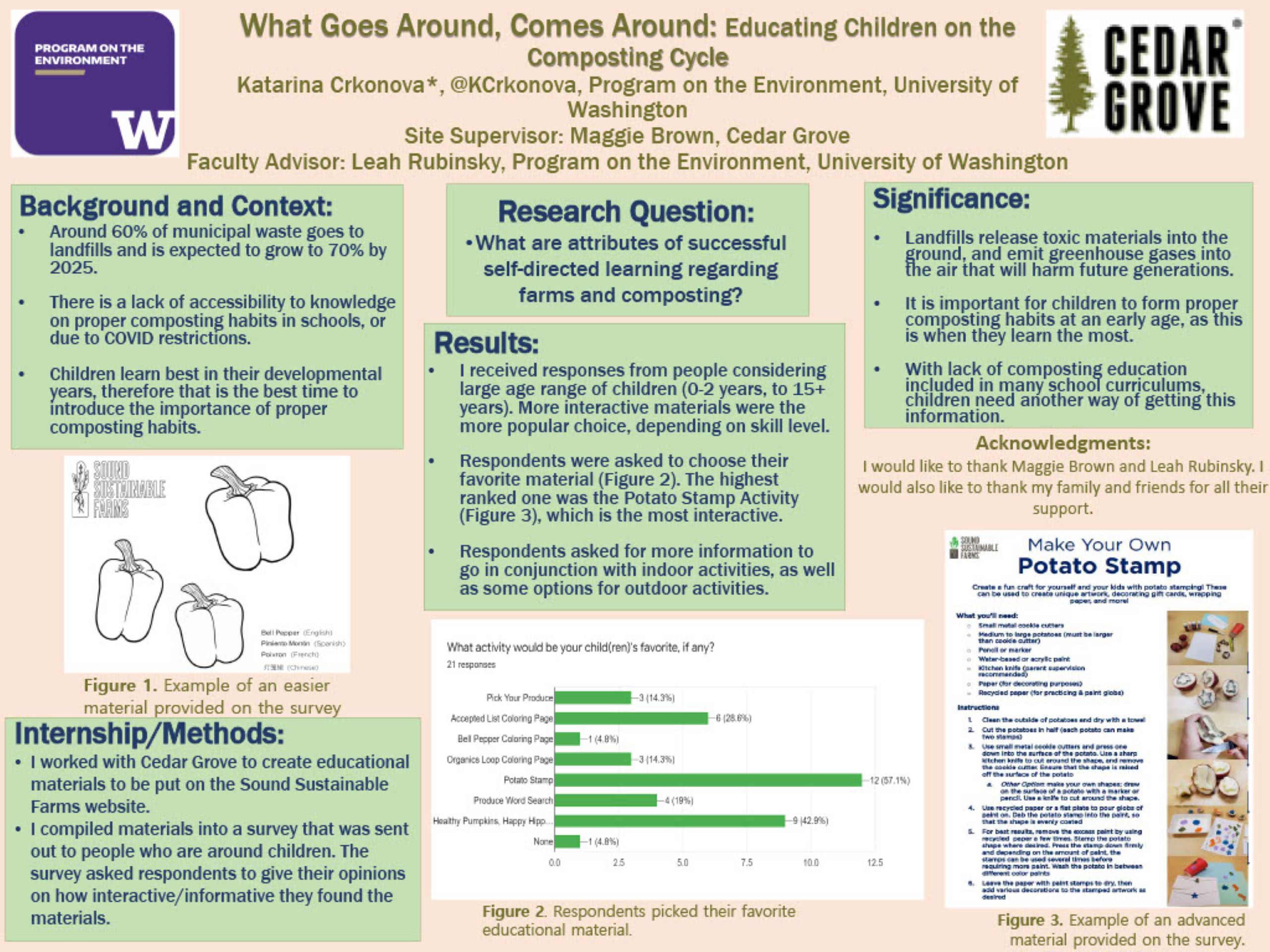 Composting is the most basic form of recycling. As humans produce more and more waste, it is important to create proper composting habits, especially at an earlier age. The purpose of this study is to discover what the successful attributes of at-home educational materials relating to farms and composting are. Considering the lack of access to on-site learning at times, particularly during times of COVID, it is important to provide the means for learning at home. I worked with Cedar Grove, a regional PNW composting company, to create various types of educational materials, which were then compiled and shared via survey. The survey was shared with people who are around children and can give their opinions on which materials seemed most interactive and informative to them. Despite respondents considering a wide age range of children, general consensus shows that higher levels of interaction are desirable for most ages. With the lack of composting education incorporated in many school curriculums, having an interactive and informative way to learn from home allows the future generations to form proper composting habits early on. With these habits, we will see organic waste being diverted from overflowing landfills and being used in a more efficient way that is beneficial for the health of the environment and the people it is home to.