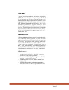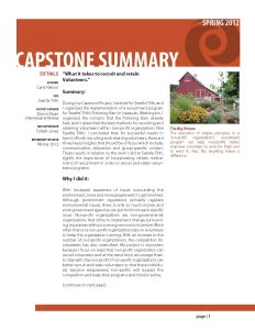 During my Capstone Project, I worked for Seattle Tilth, and I organized the implementation of a recruitment program for Seattle Tilth’s Pickering Barn in Issaquah, Washington. I organized the contacts that the Pickering Barn already had, and I researched the best methods for recruiting and retaining volunteers within non-profit organizations (like Seattle Tilth). I concluded that, for successful results in terms of both recruiting and retaining volunteers, there are three key principles that should be of focus which include; communication, education and group-specific contact. These results in relation to the work I did at Seattle Tilth, signify the importance of incorporating certain mechanisms of recruitment in order to recruit and retain volunteers long term.