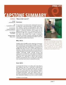For my project, I was interested in studying the barriers to recycling and composting people in Seattle experience. I also wanted to present recommendations about what steps may help with reducing the barriers. To discover the barriers, I conducted interviews with shoppers at two different grocery stores: a PCC in Fremont and a QFC in North Beacon Hill. I also completed a recycling infrastructure study at the Seattle Tower to gain a commercial perspective on barriers to proper waste disposal. Finally, I looked at various policy and behavioral studies to discover what might best address these barriers.