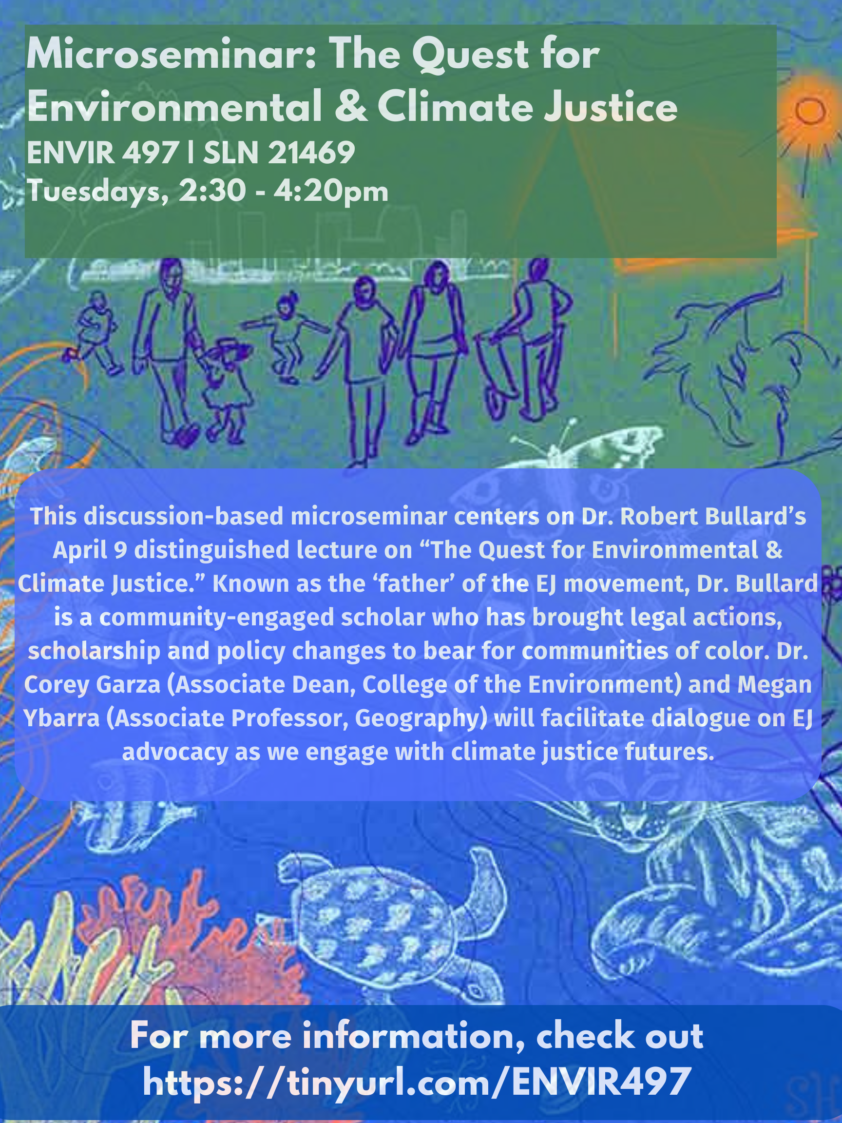 This spring, ENVIR 497 A is offered as a 2-credit microseminar on the Quest for Climate & Environmental Justice. This small form, discussion-based course culminates with an in-person visit and public lecture by distinguished EJ scholar Dr.