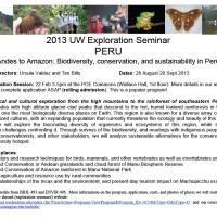 In this seminar, you will be working closely with peers from the UW, applying your personal curiosity or expertise to two small-group projects, one each in the Andes and the Amazon, relating to biological resources and/or conservation. The program directors and Peruvian researchers, will guide you and share their combined expertise in ecological, sociological, and anthropological methods to gather relevant data, as well as their perspectives on conservation in the region. Be prepared to learn more, however, from the experiences we will have in the field as we travel through stunning landscapes full of natural and cultural wonders!
