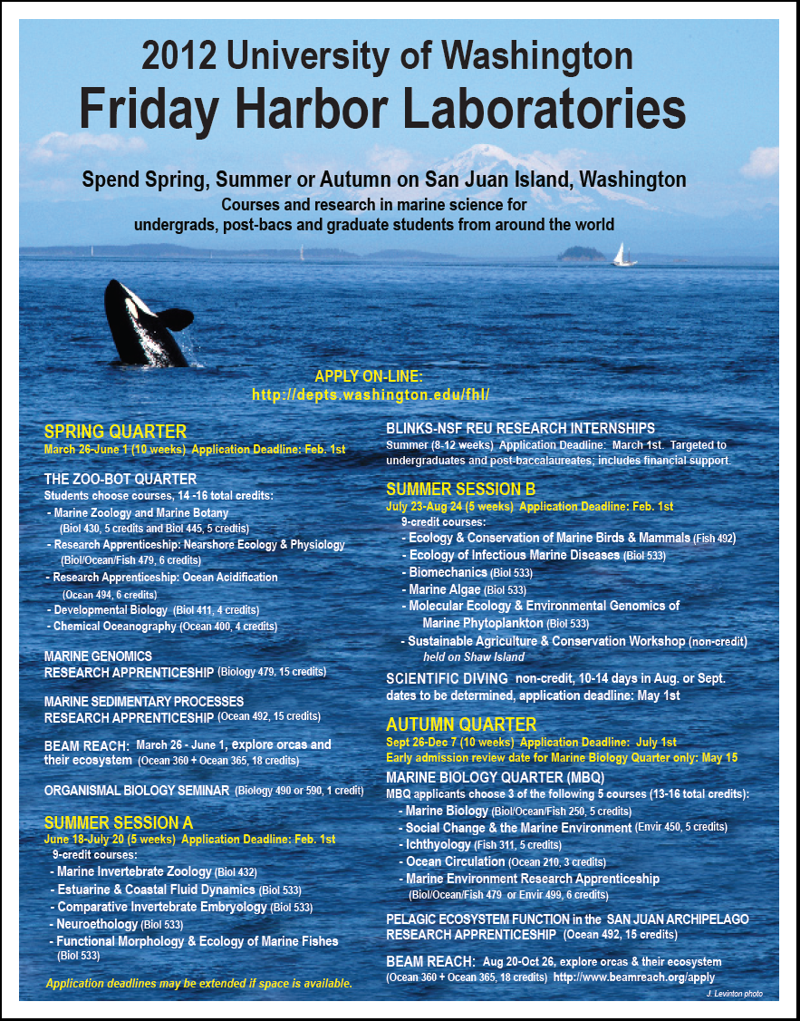 Learn how you can get involved with Friday Harbor Labs (FHL), UW’s world renowned marine station on San Juan Island. FHL faculty and former students will share their experiences, talk about their research, and answer questions. FHL is an ideal place to spend a quarter and jump-start your career in the marine sciences, education, medicine, law and policy, poetry and more! All courses involve fieldwork, boats, laboratory work, and research mentorship from award-winning faculty. Any UW student can spend a quarter at FHL.