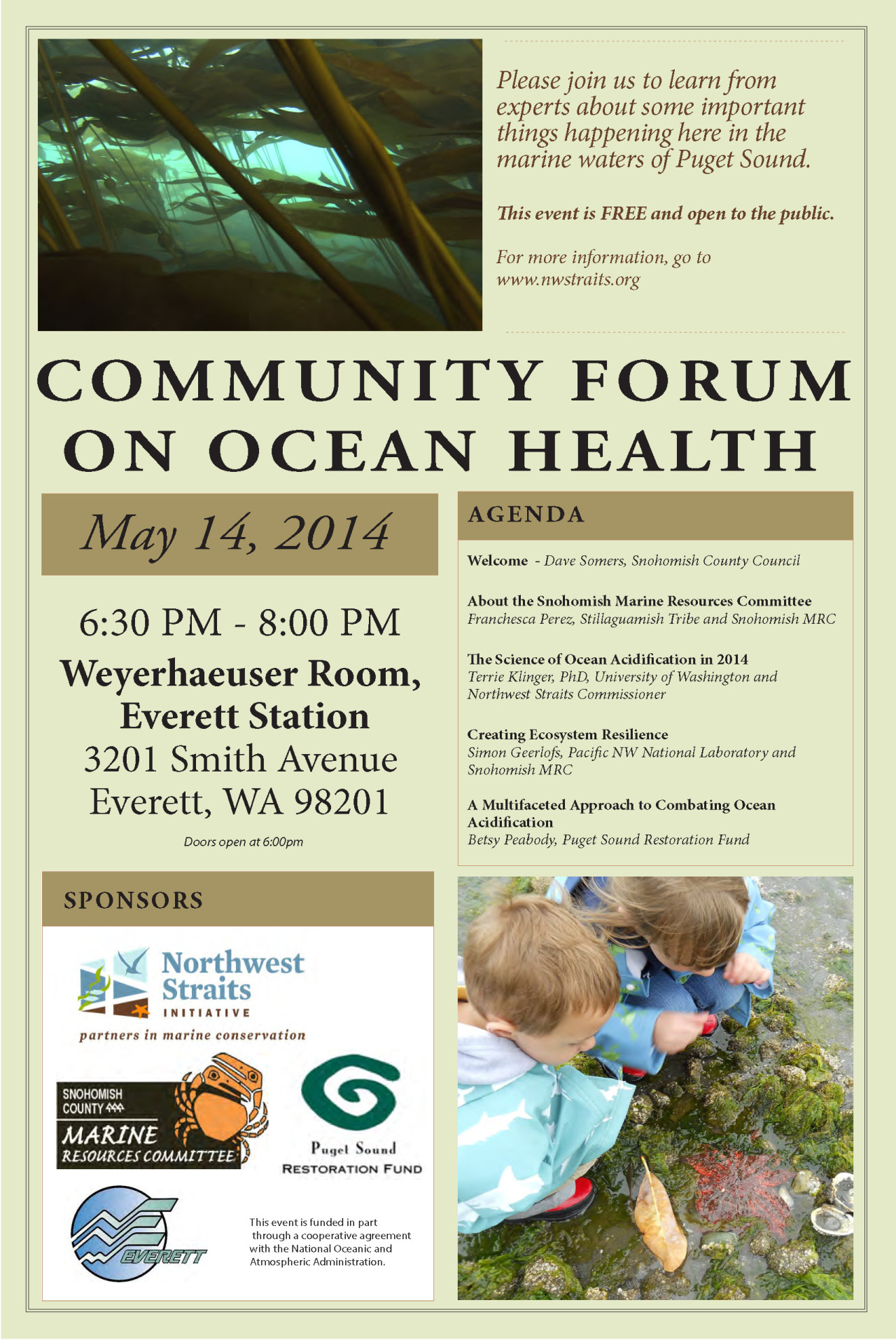 The event is a community forum focusing on issues facing our Puget Sound waters. Presenters will include Terrie Klinger and Betsy Peabody.